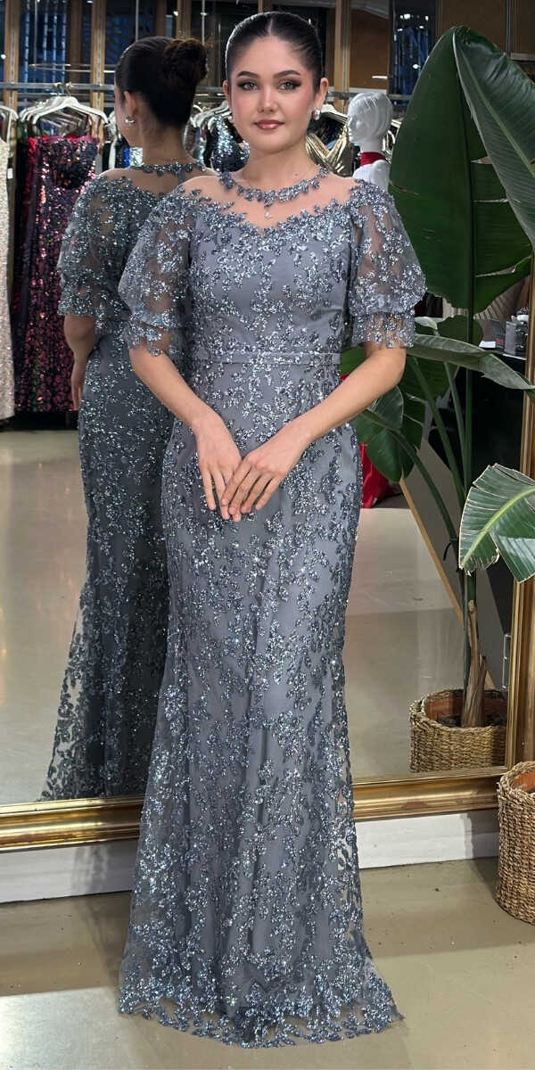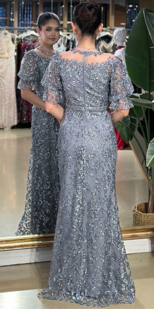 Açık Gri Renk Düz Kesim Uzun Abiye Elbise, Simli Kumaştan Üretilmiş olup Simlerin Işıltısıyla Çok Hoş Gözükeceksiniz Dantel Detayı Işıltısıyla Göz Kamaştıracakır.