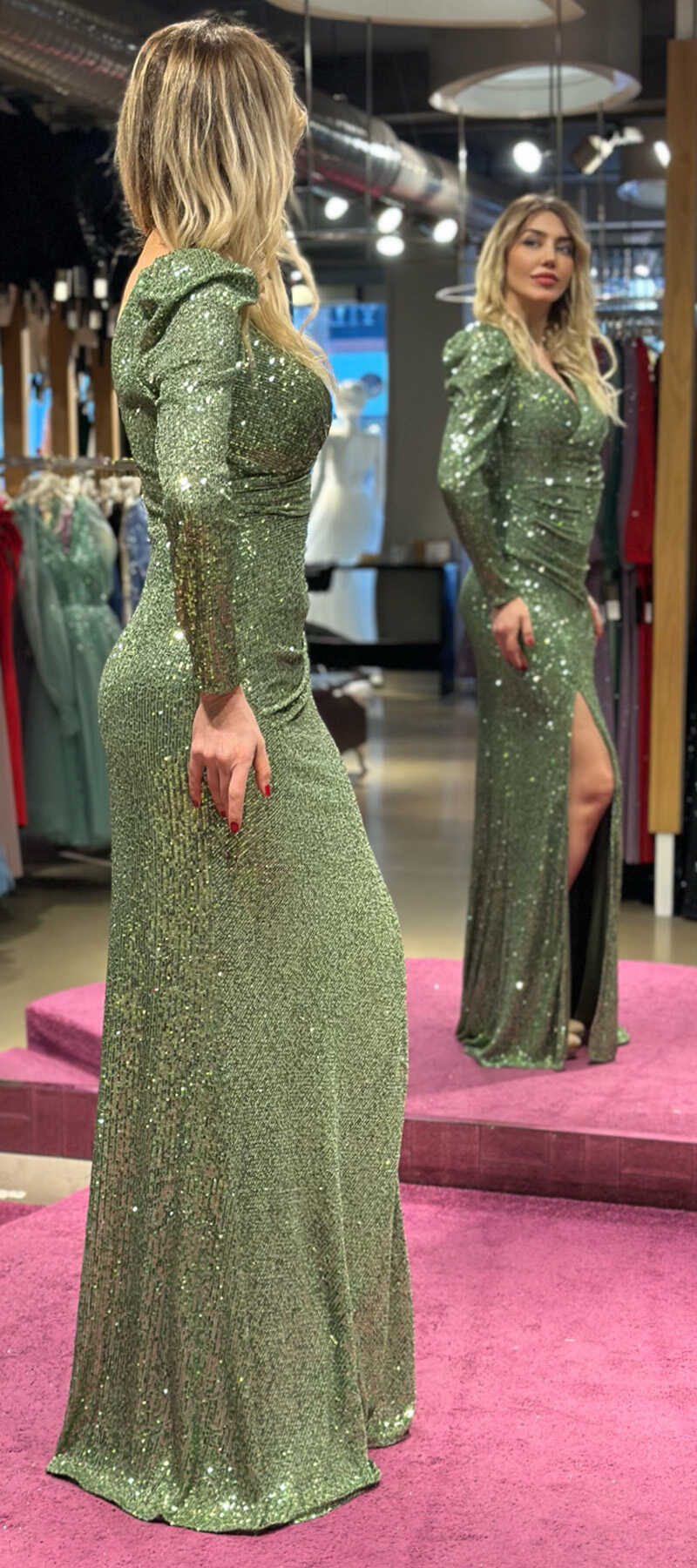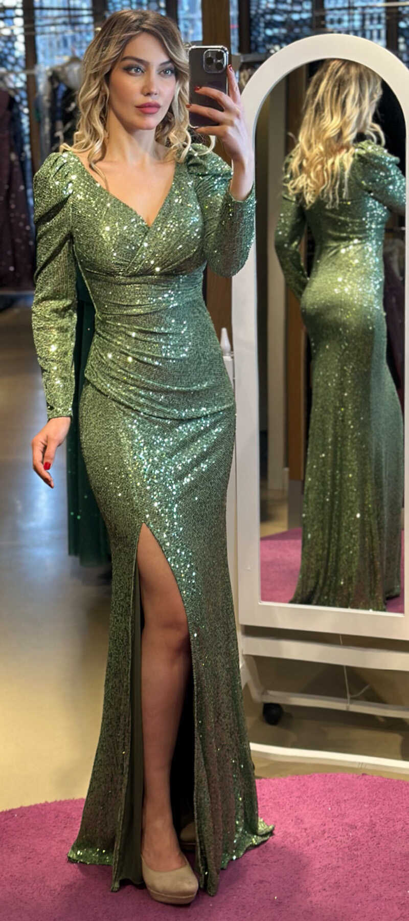 Açık Yeşil Uzun Kollu Yırtmaçlı Düz Kesim Payet Uzun Abiye Elbise 7321