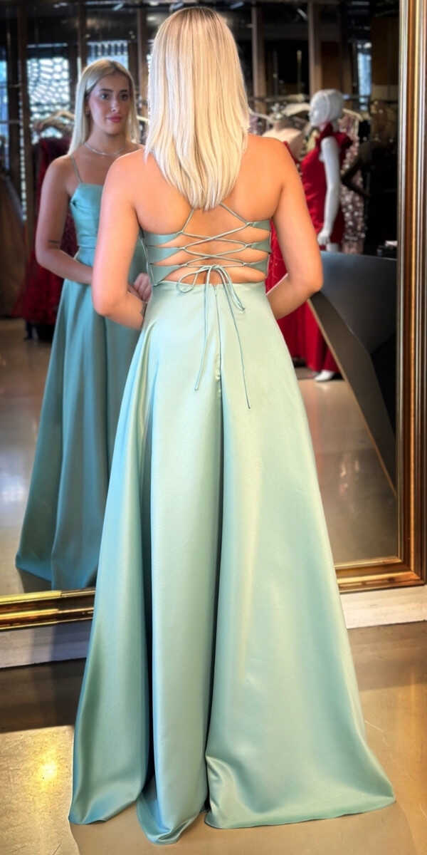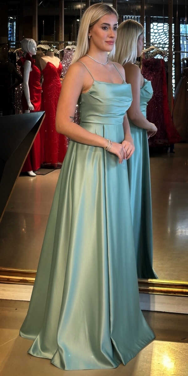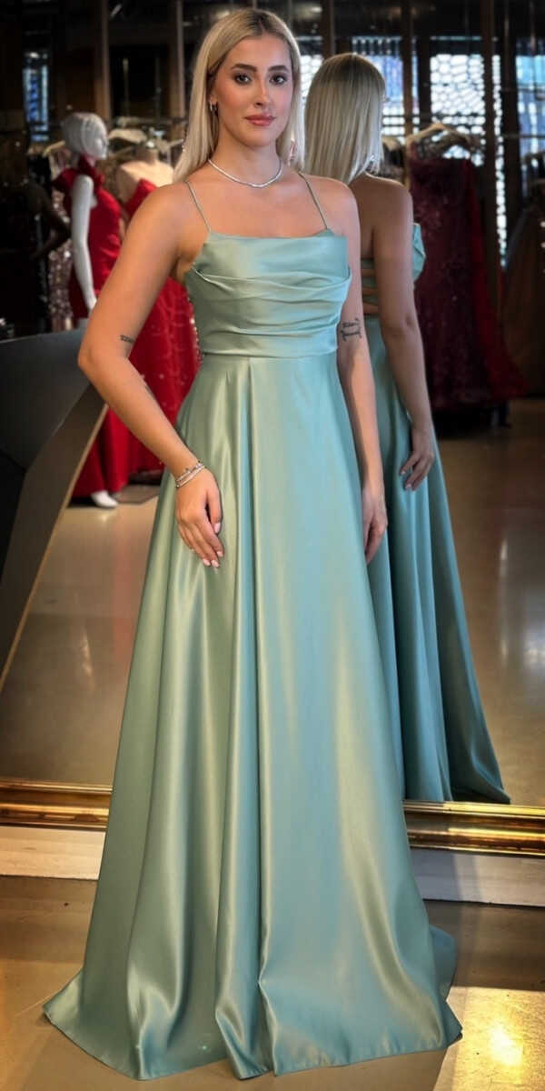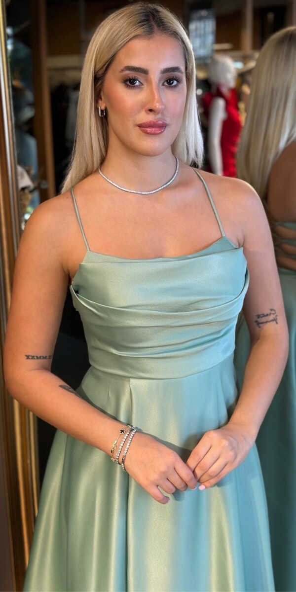 Adaçayı Rengi Kloş Etekli Uzun Abiye Elbise, Saten Kumaştan Üretilmiş olup Satenin Pürüzsüz Işığı Görünümünüze Zarafet Katacaktır. Elbisedeki İp Askılar Kullanım Kolaylığı Yaratacaktır. Şık Sırt Dekoltesi Size Çok Yakışacak.