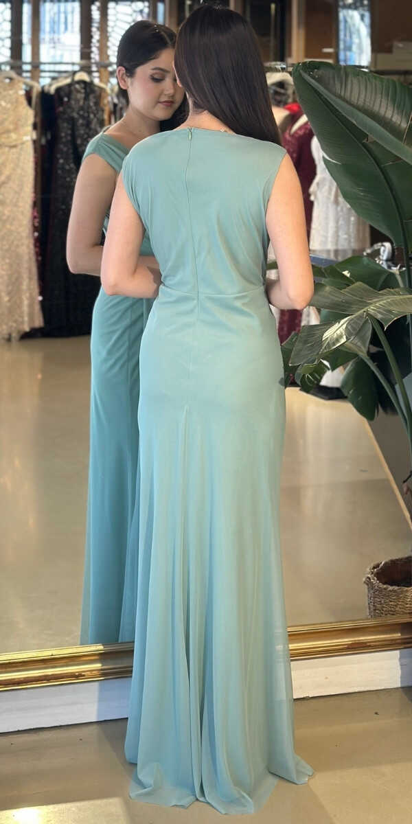 AdaÇayı Yeşili Kalın Askı Yırtmaçlı Düz Kesim Likralı Uzun Abiye Elbise 7648