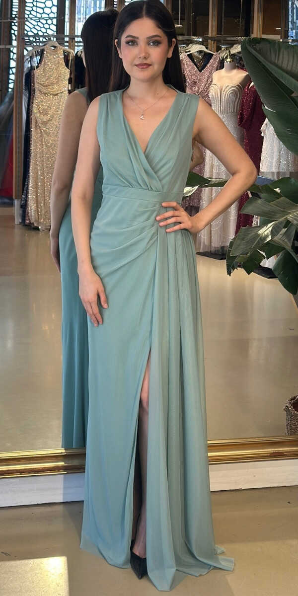 Yeşil V Yaka Kalın Askı Düz Kesim Simli Uzun Abiye Elbise 7557