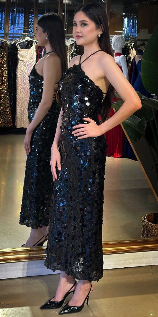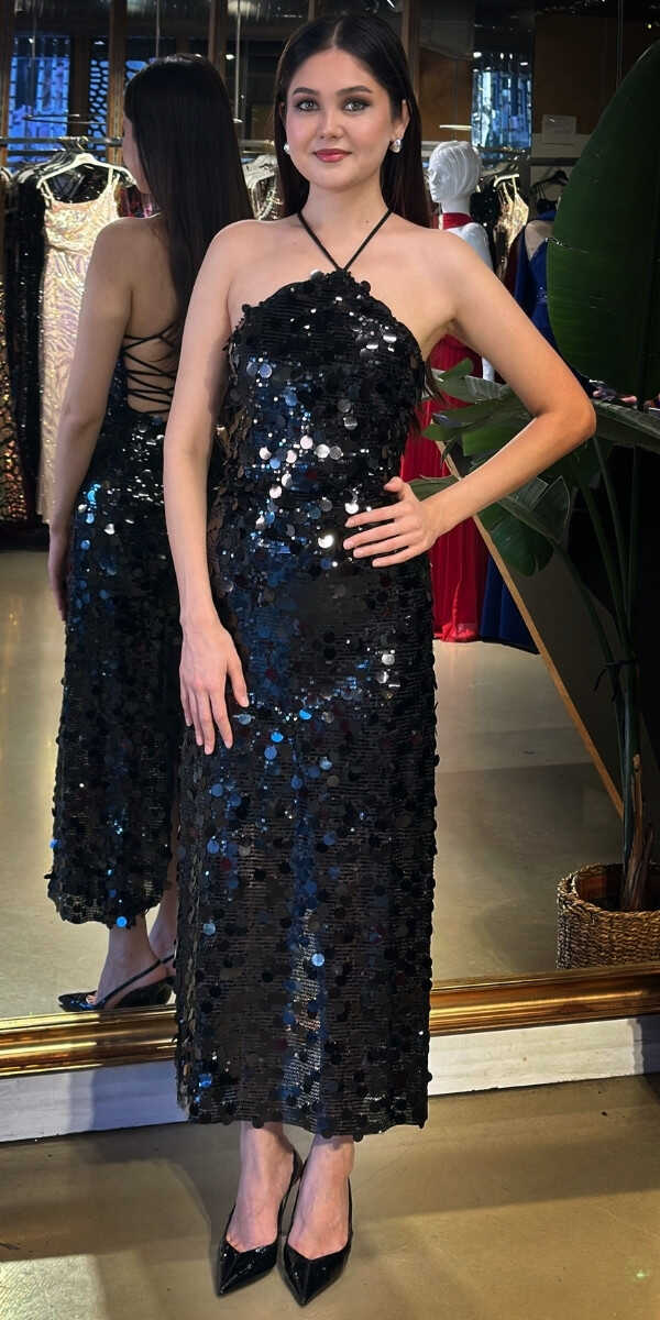 Halter Yaka A.P Siyah Renk Düz Kesim Midi Abiye Elbise, Payet Kumaştan Üretilmiş olup Pırıltısıyla Göz Kamaştıracaktır. Şık Sırt Dekoltesi Size Çok Yakışacak. Yırtmaç Detayı Cesur ve Çarpıcı Bir Stil Sunacaktır.