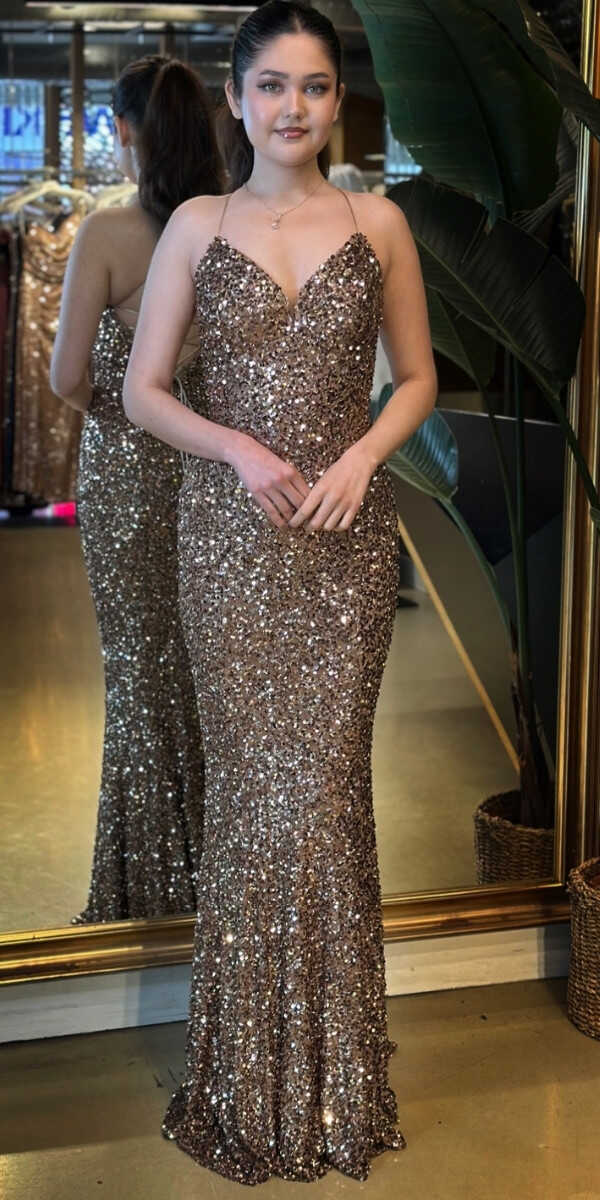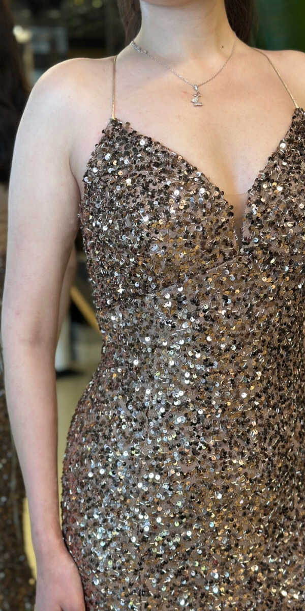 Bakır Renk Balık Etekli Uzun Abiye Elbise, Pul Payet Kumaştan Üretilmiş olup Likralı ve Payet İşlemeli Kumaşı, Dikkat Çekici Işıltısının Yanı Sıra Vücudunuzu Sararak Sizi Olduğunuzdan İnce Gösterecektir. Elbisedeki İp Askılar Kullanım Kolaylığı Yaratacaktır. Şık Sırt Dekoltesi Size Çok Yakışacak.