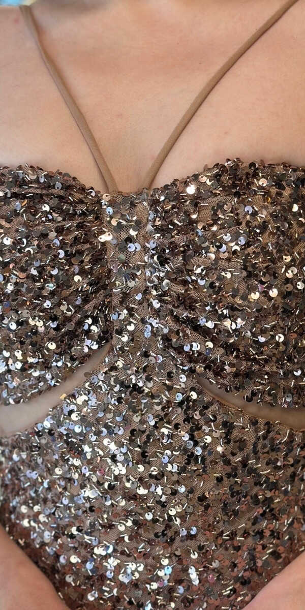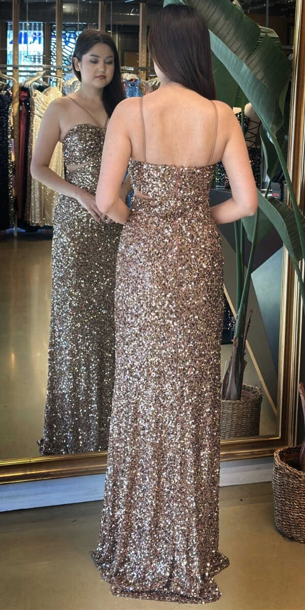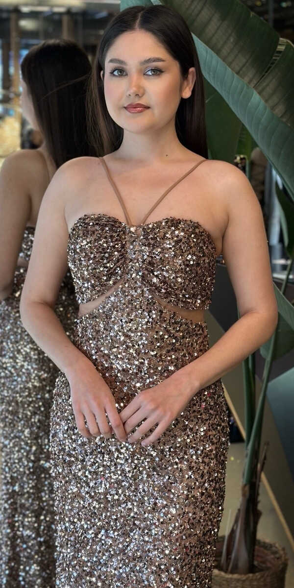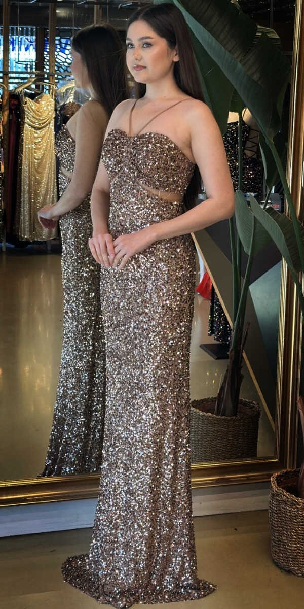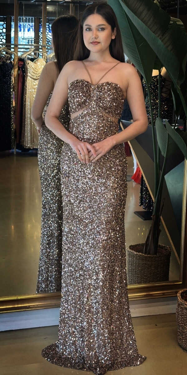 Bakır Renk Düz Kesim Uzun Abiye Elbise, Payet Kumaştan Üretilmiş Olup Pırıltısıyla Göz Kamaştıracaktır.