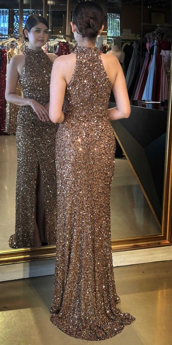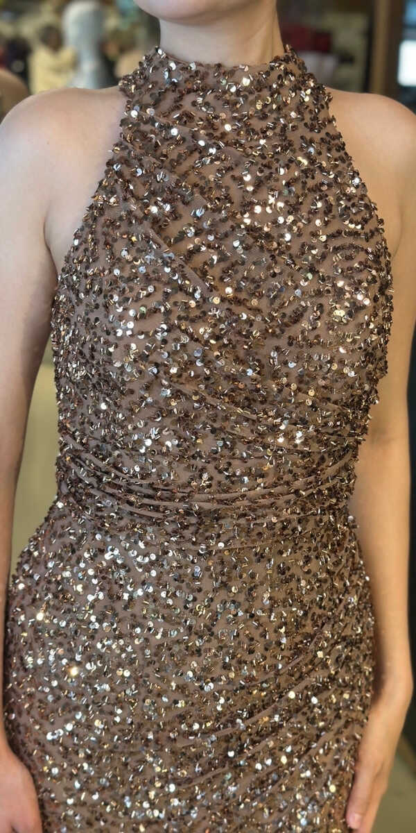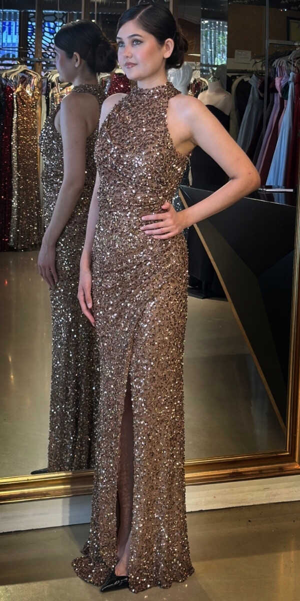 Bakır Renk Düz Kesim Uzun Abiye Elbise, Payet Kumaştan Üretilmiş olup Pırıltısıyla Göz Kamaştıracaktır. Yırtmaç Detayı Cesur ve Çarpıcı Bir Stil Sunacaktır.