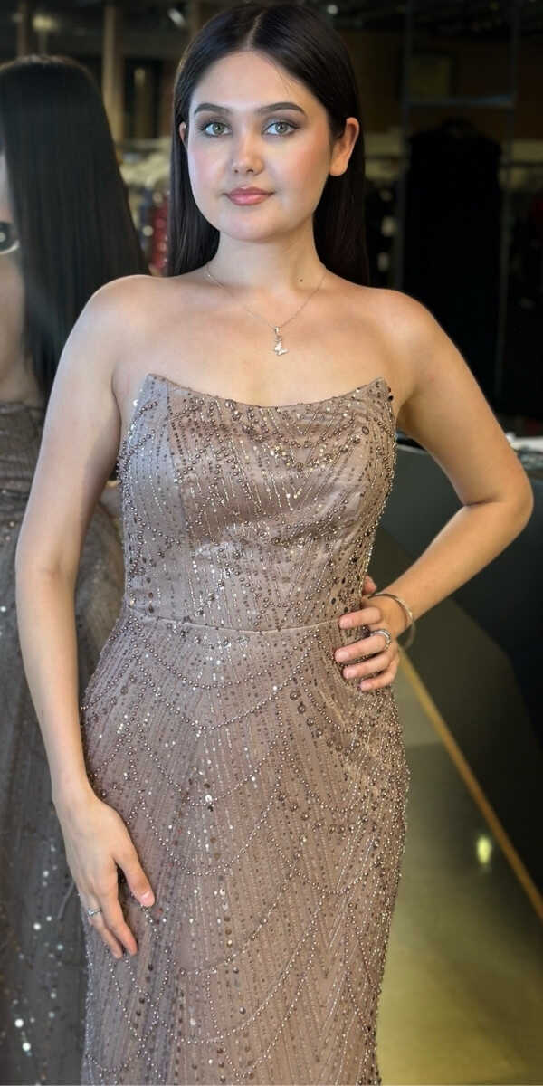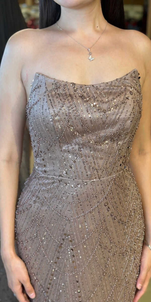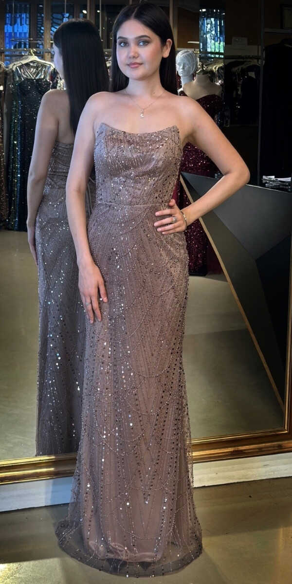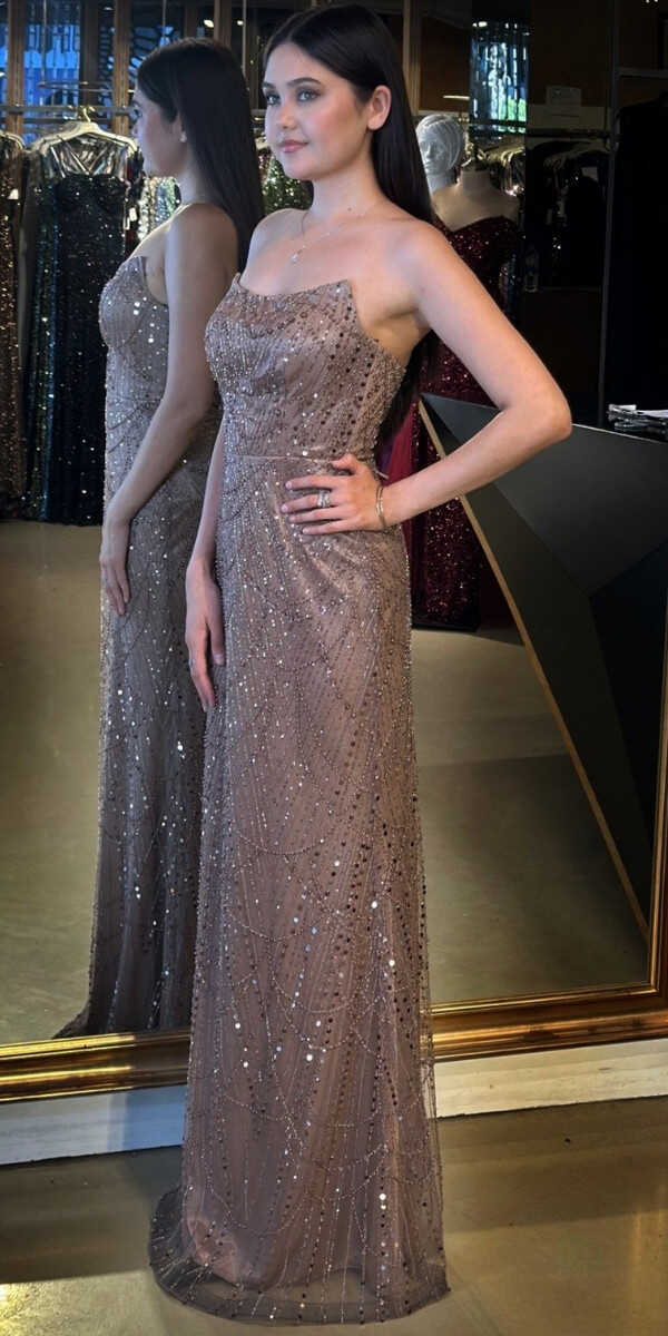 Bakır Renk Düz Kesim Uzun Abiye Elbise, Pullu Boncuklu Kumaştan Üretilmiş olup Parıltı ve Zarafetin Buluştuğu Kumaş Türü Sizi Işıl Işıl Gösterecektir. Şık Sırt Dekoltesi Size Çok Yakışacak