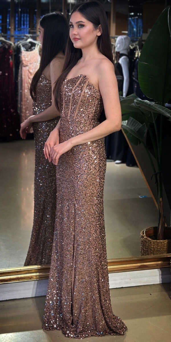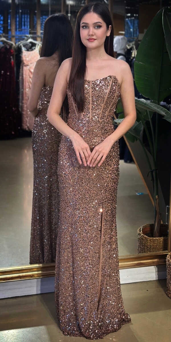 Straplez Yaka Bakır Renk Düz Kesim Uzun Abiye Elbise, Payet Kumaştan Üretilmiş olup Pırıltısıyla Göz Kamaştıracaktır. Şık Sırt Dekoltesi Size Çok Yakışacak. Yırtmaç Detayı Cesur ve Çarpıcı Bir Stil Sunacaktır.