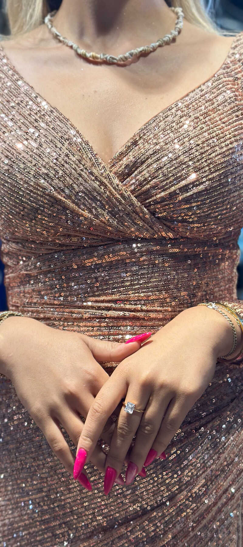Bakır Renk Düz Kesim Uzun Abiye Elbise, Payet Kumaştan Üretilmiş Olup Pırıltısıyla Göz Kamaştıracaktır.Yırtmaç Detayı Cesur ve Çarpıcı Bir Stil Sunacaktır.