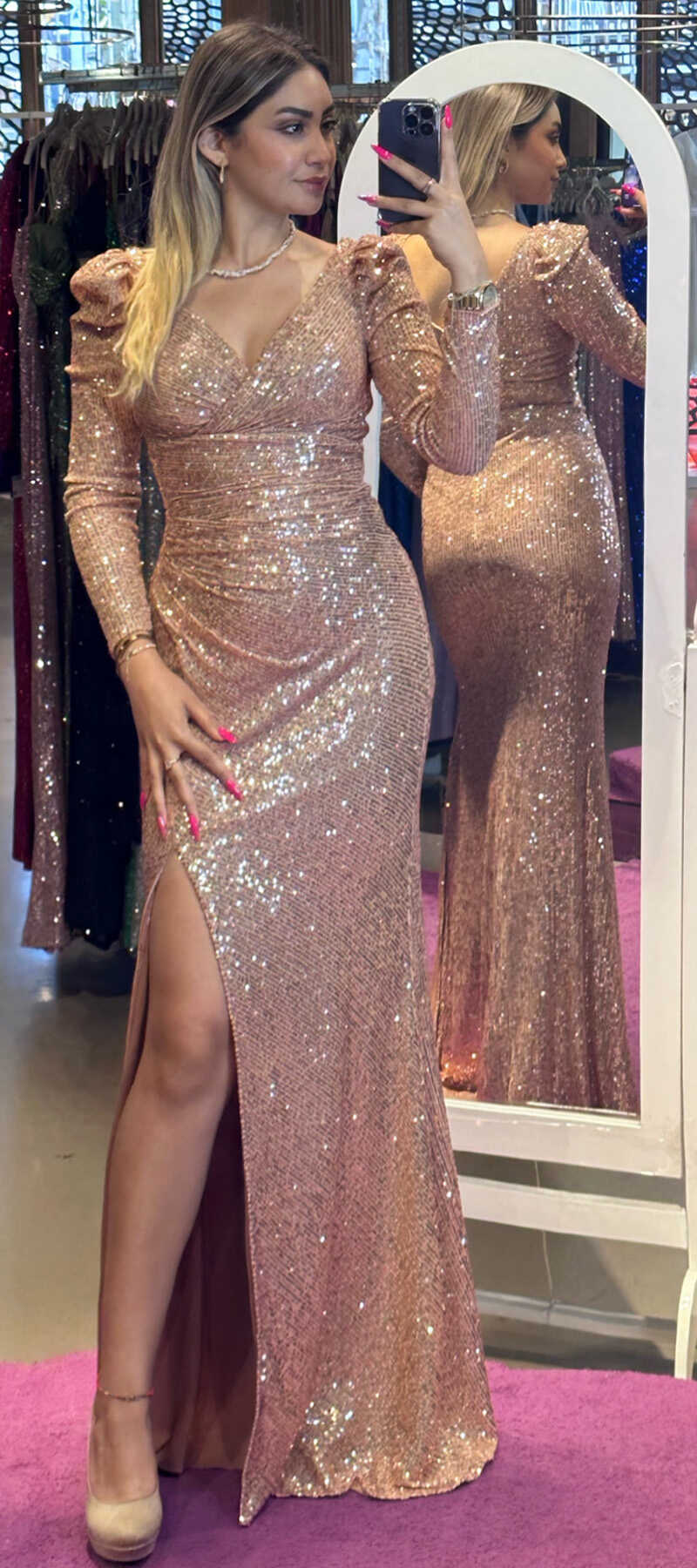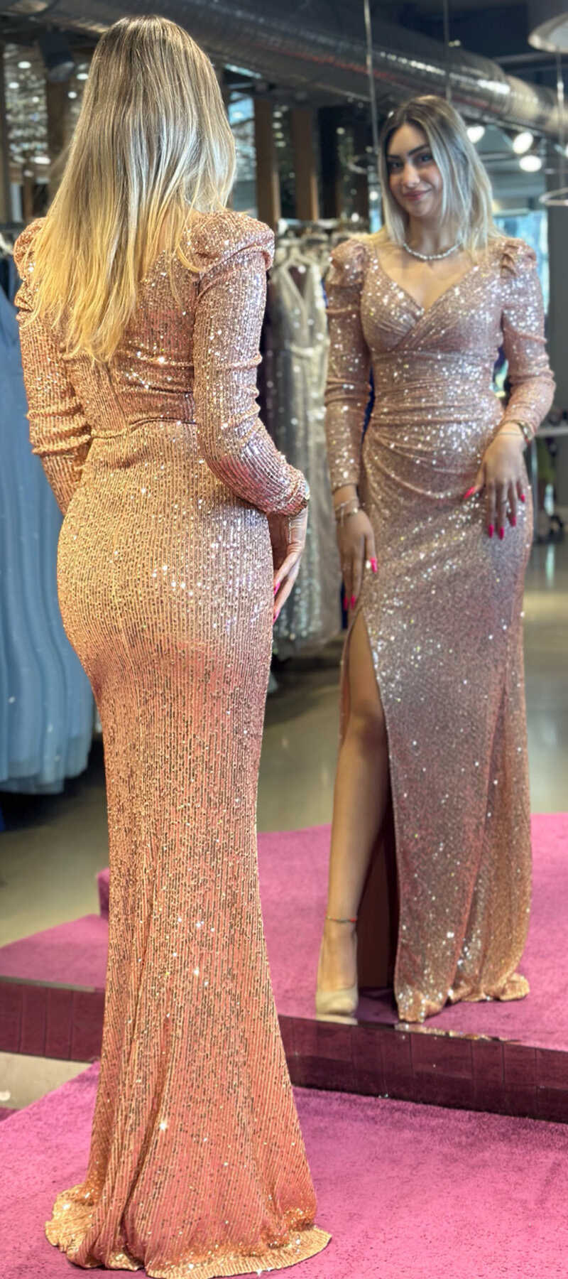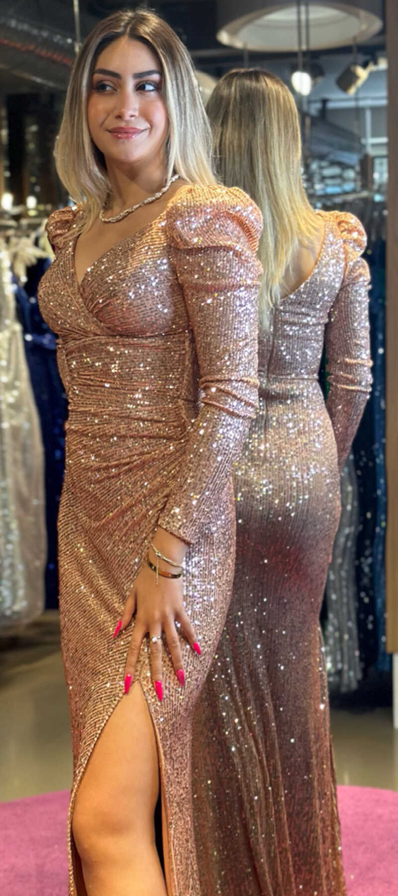Bakır Uzun Kollu Yırtmaçlı Düz Kesim Payet Uzun Abiye Elbise 7321