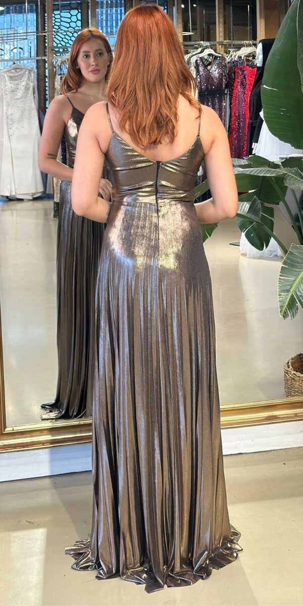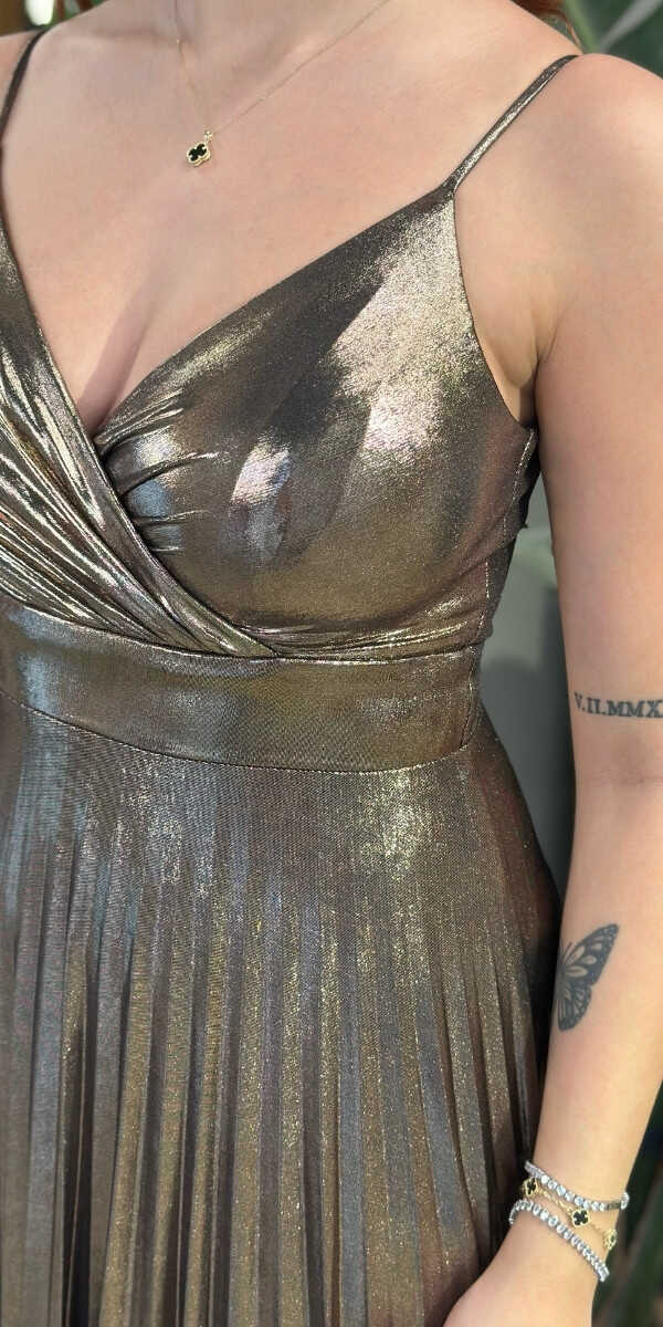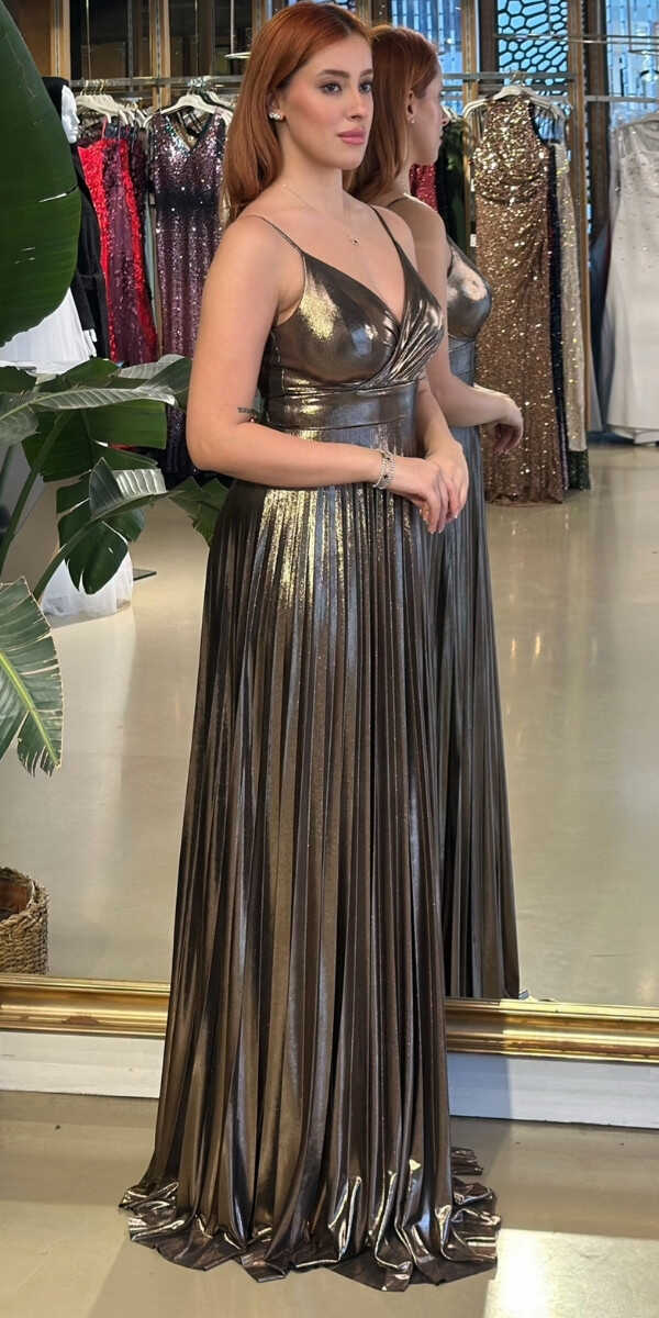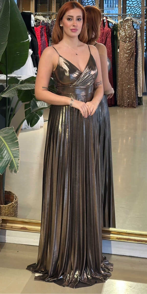 V Yaka Bakır Renk Kloş Etekli Uzun Abiye Elbise, Parlak Kumaş Kumaştan Üretilmiş olup Parlak dokusu sayesinde her adımda ışıltınızı yansıtın. Elbisedeki İp Askılar Kullanım Kolaylığı Yaratacaktır.