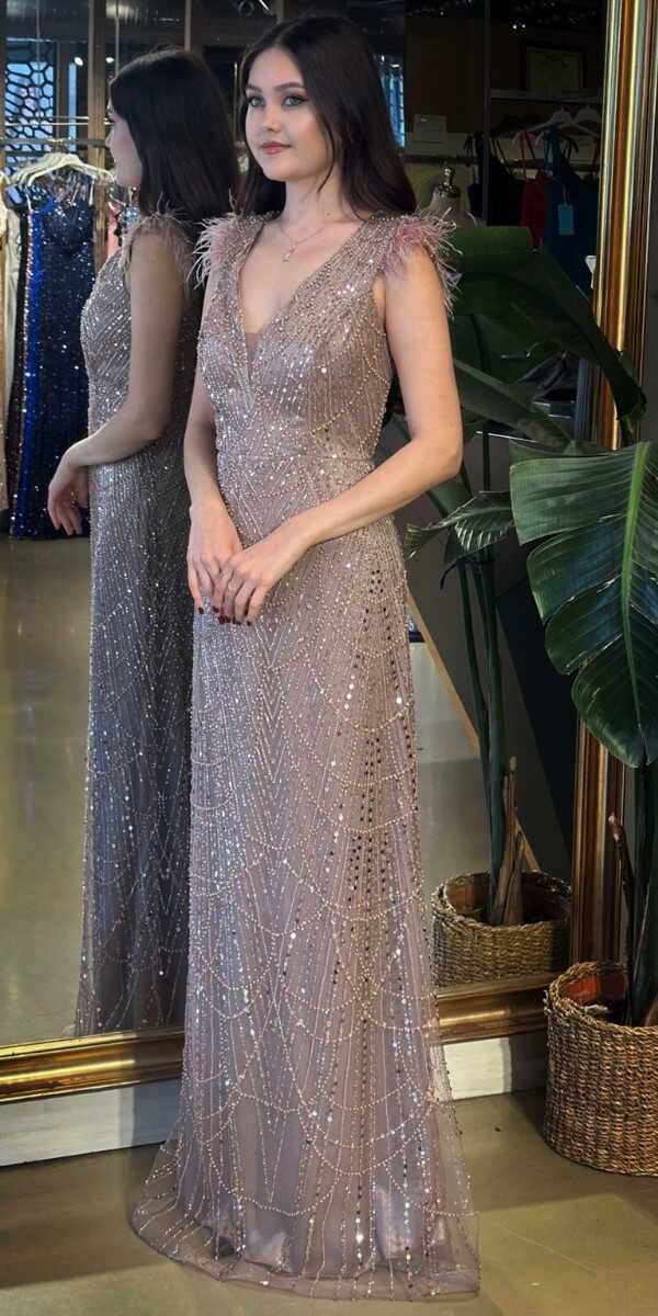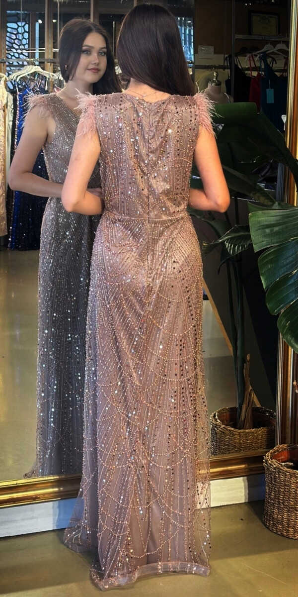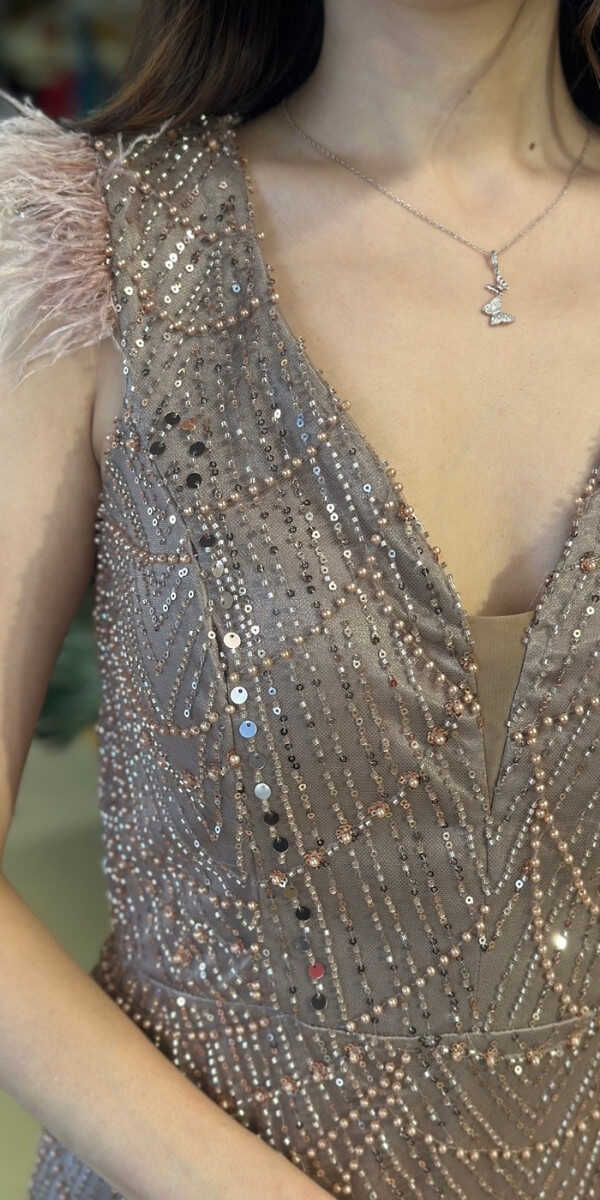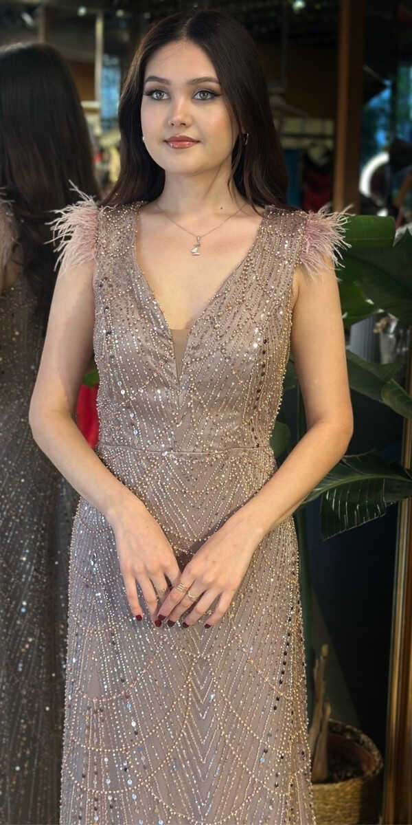 V Yaka Bakır Renk Düz Kesim Uzun Abiye Elbise, Pullu Boncuklu Kumaştan Üretilmiş olup Parıltı ve Zarafetin Buluştuğu Kumaş Türü Sizi Işıl Işıl Gösterecektir. Kalın askılı yapısıyla destekleyici ve modern bir görünüm sağlar. Uçuşan Tüy Detay Sizi Oldukça Havalı Gösterecek.