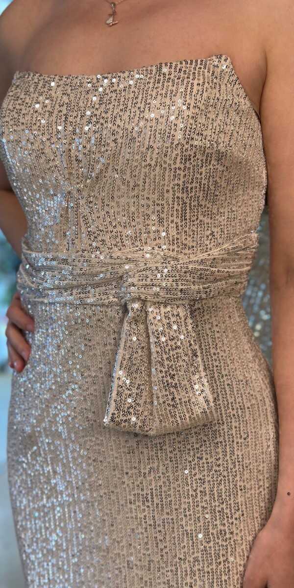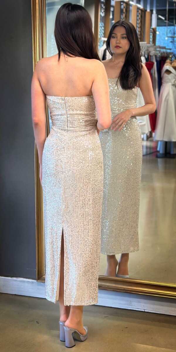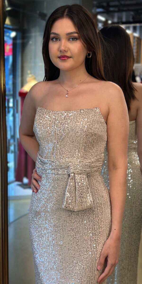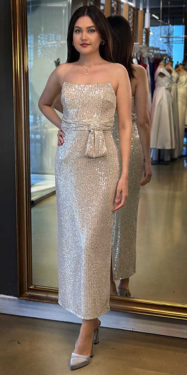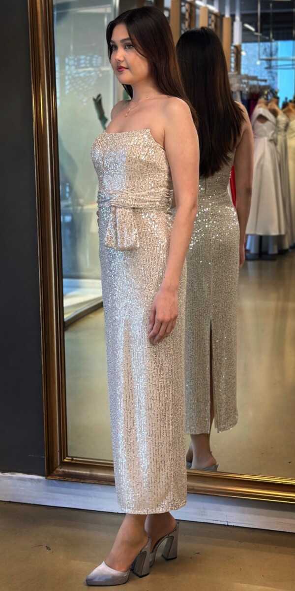 Bej Renk Düz Kesim Midi Abiye Elbise, Payet Kumaştan Üretilmiş olup Pırıltısıyla Göz Kamaştıracaktır.