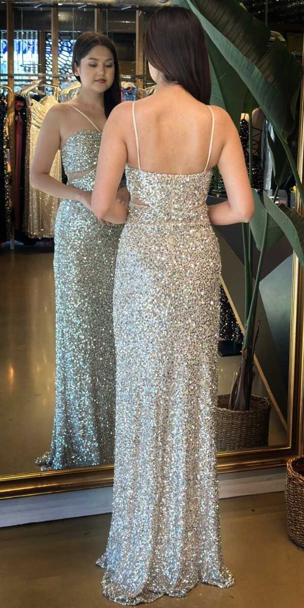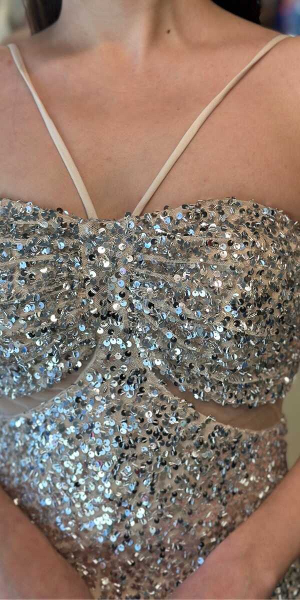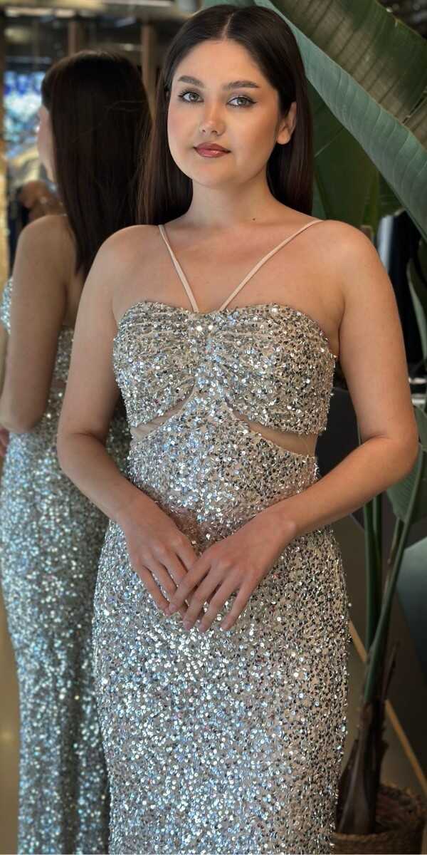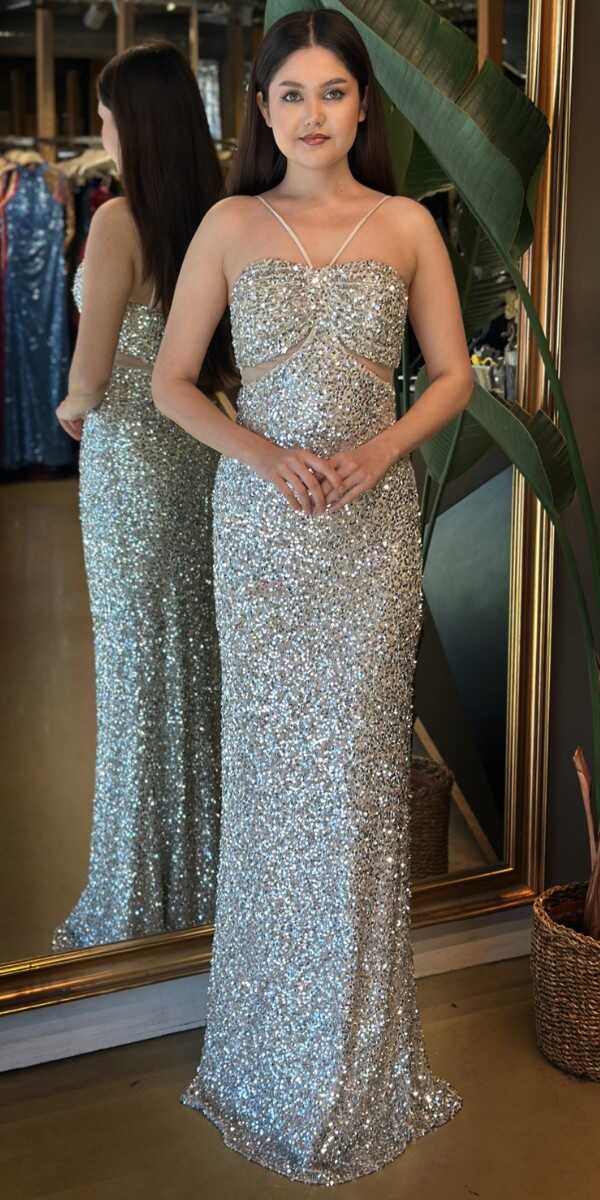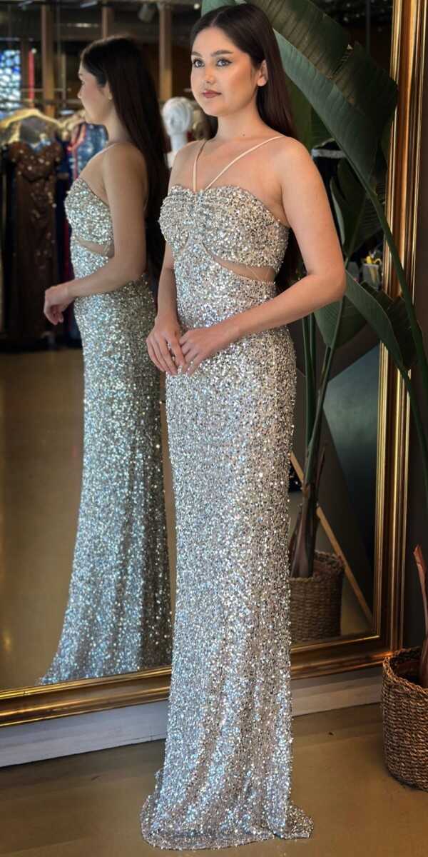 Bej Renk Düz Kesim Uzun Abiye Elbise, Payet Kumaştan Üretilmiş Olup Pırıltısıyla Göz Kamaştıracaktır.