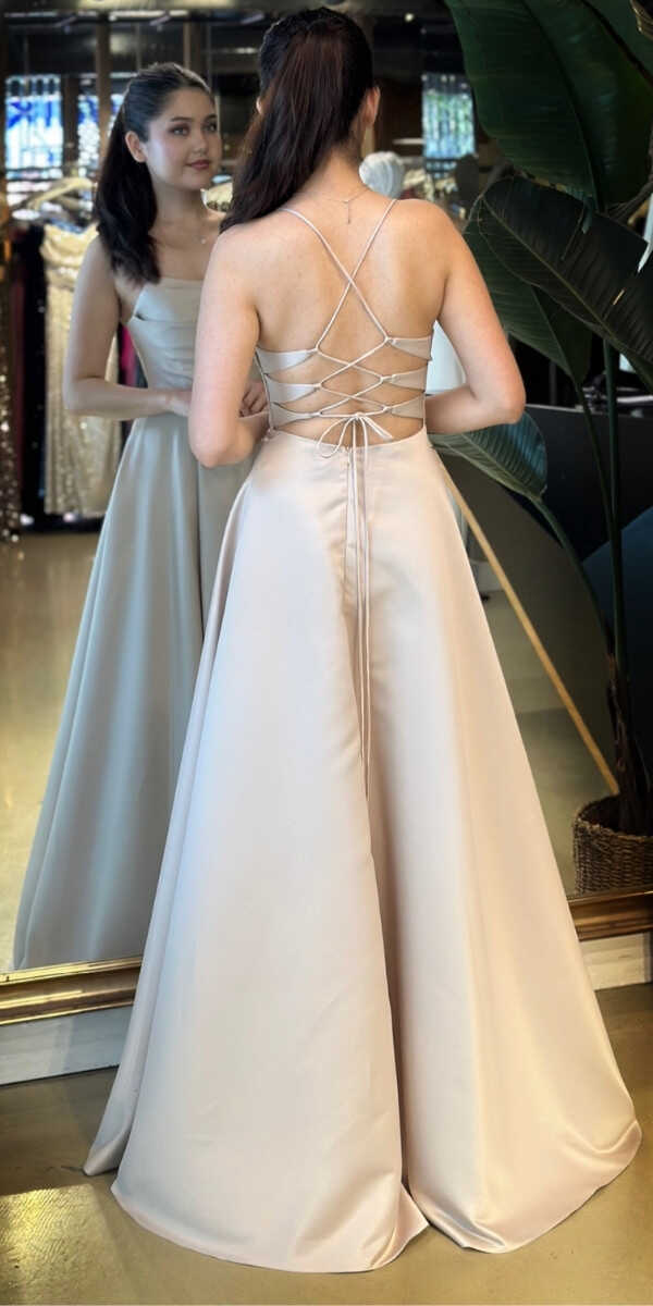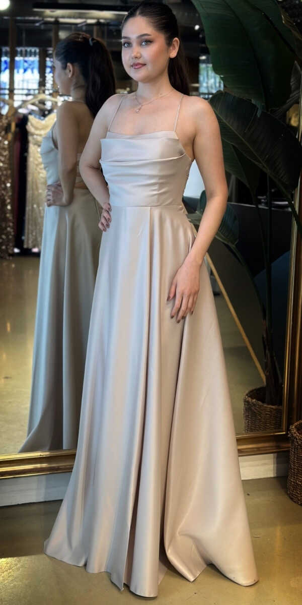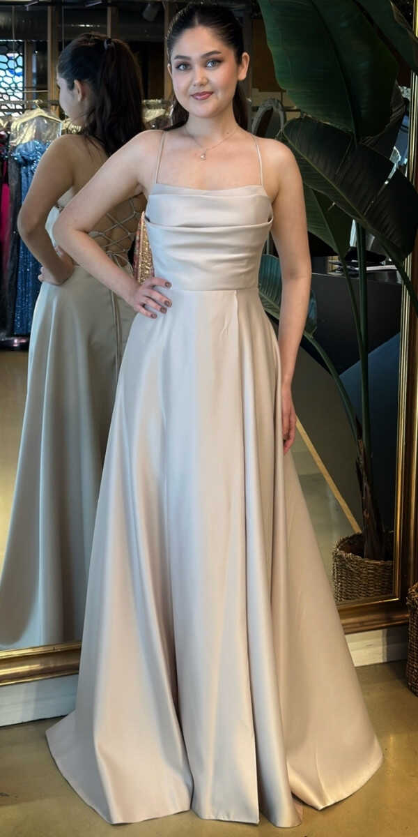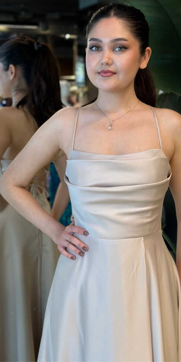 Bej Renk Kloş Etekli Uzun Abiye Elbise, Saten Kumaştan Üretilmiş olup Satenin Pürüzsüz Işığı Görünümünüze Zarafet Katacaktır. Elbisedeki İp Askılar Kullanım Kolaylığı Yaratacaktır. Şık Sırt Dekoltesi Size Çok Yakışacak.