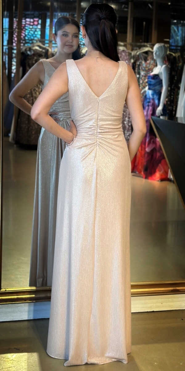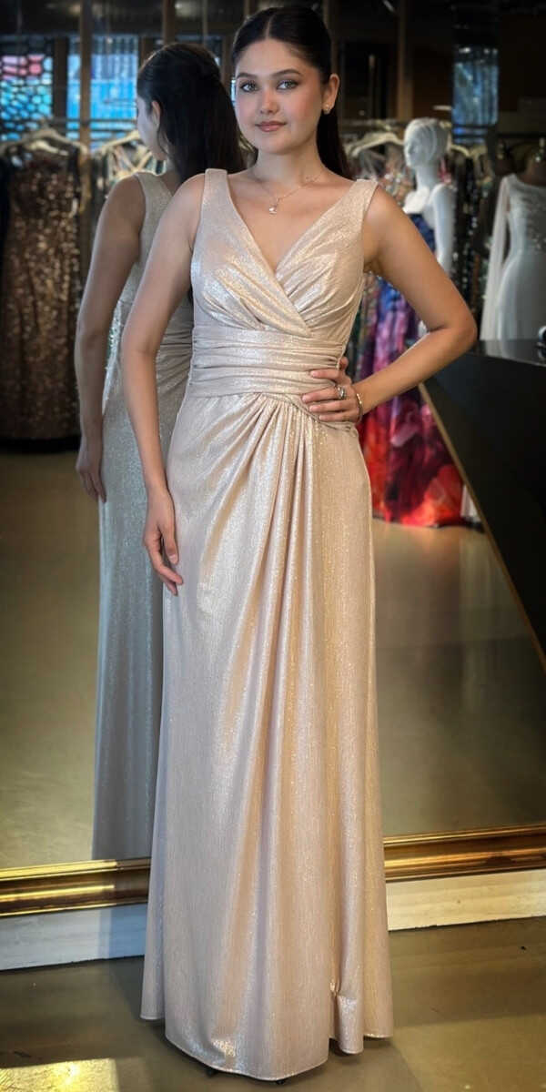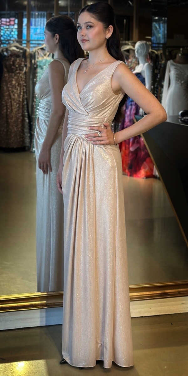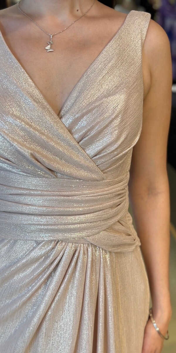 Bej Renk Düz Kesim Uzun Abiye Elbise, Simli Kumaştan Üretilmiş olup Simlerin Işıltısıyla Çok Hoş Gözükeceksiniz Adeta Göz Kamaştıran Bir Görünüm Yaratacak.