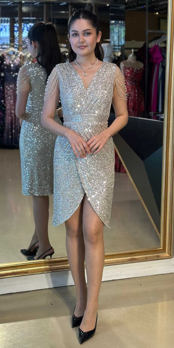 Bej Kalın Askılı Pullu Kısa Abiye Elbise 95041