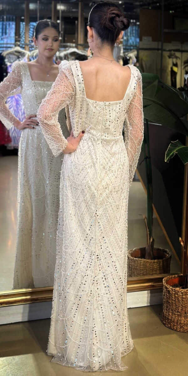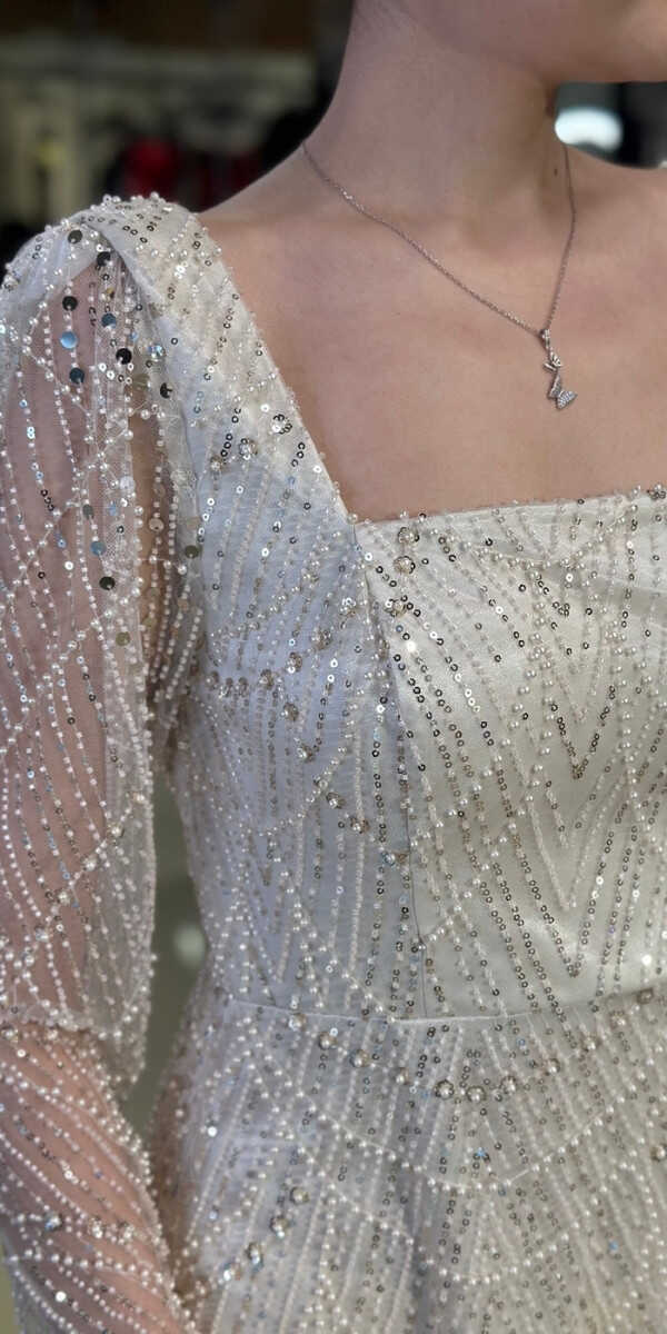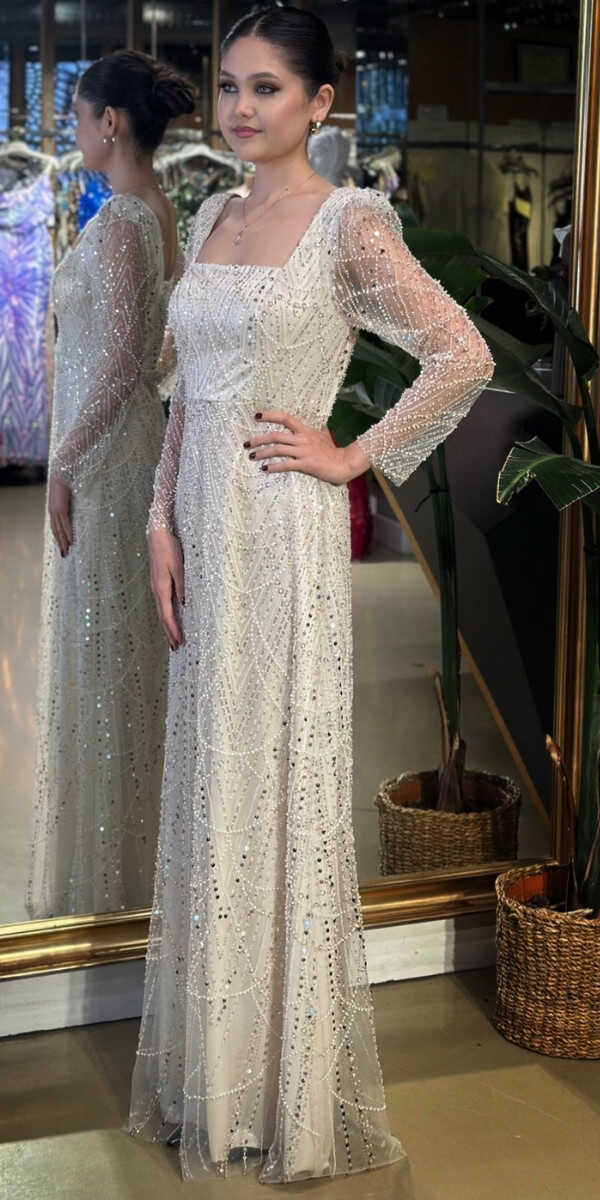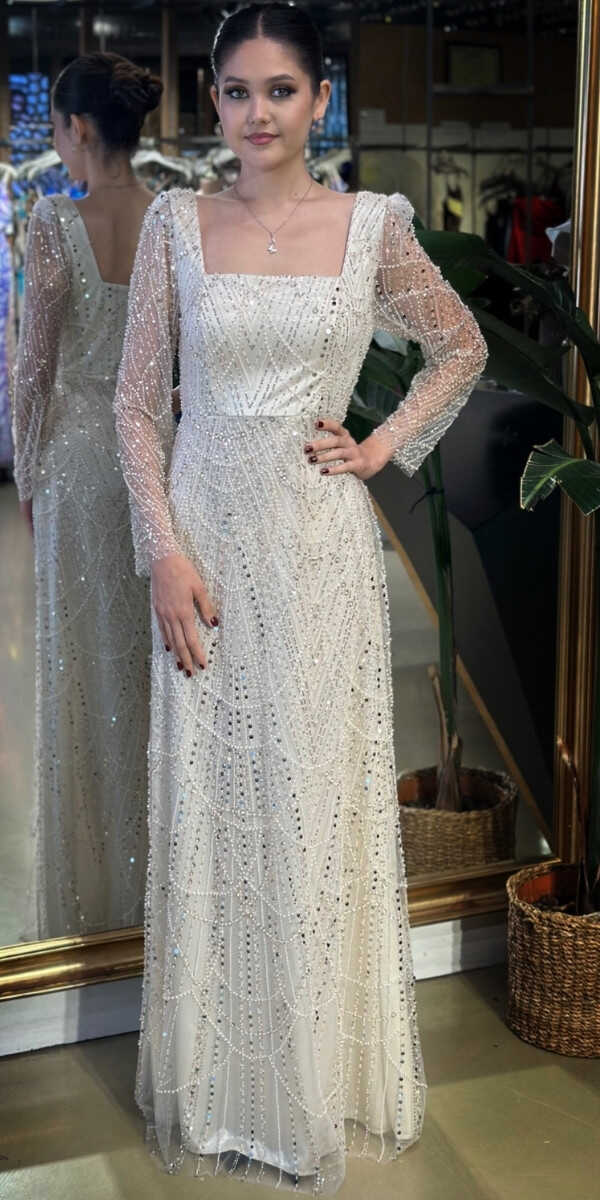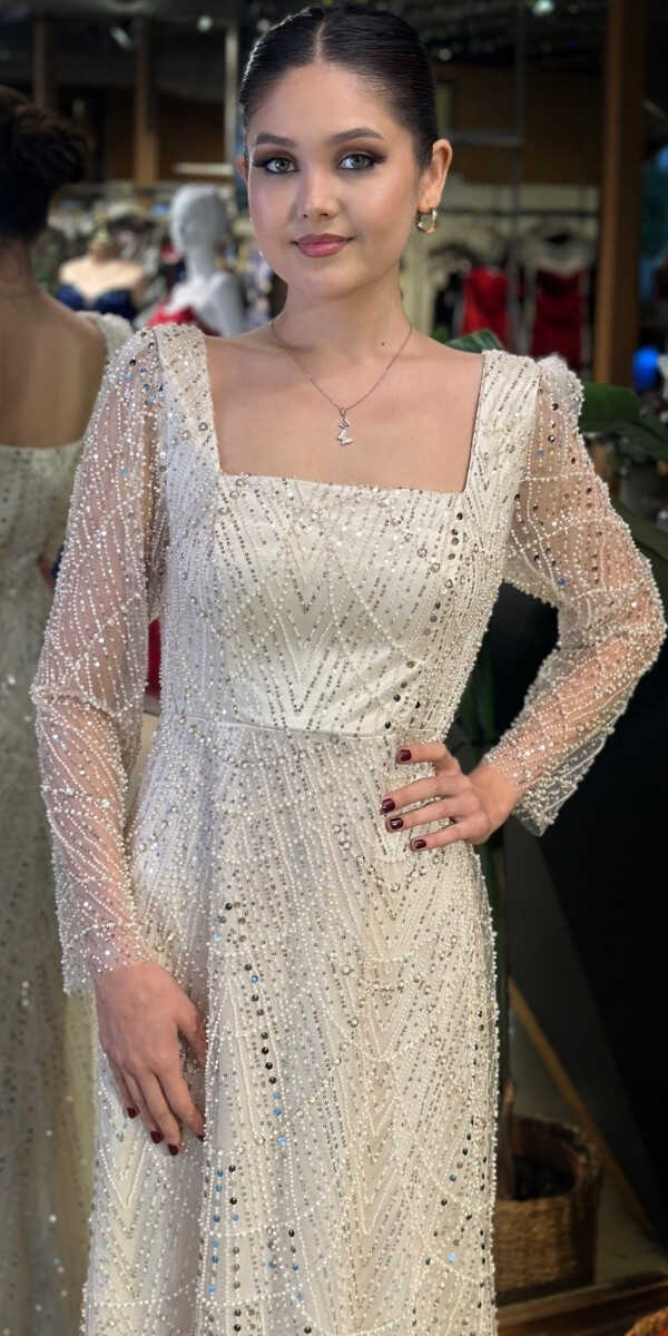 Kare Yaka Bej Renk Kloş Etekli Uzun Abiye Elbise, Pullu Boncuklu Kumaştan Üretilmiş olup Parıltı ve Zarafetin Buluştuğu Kumaş Türü Sizi Işıl Işıl Gösterecektir. Uzun kollarıyla, kollarınızı zarif bir şekilde kapatır.