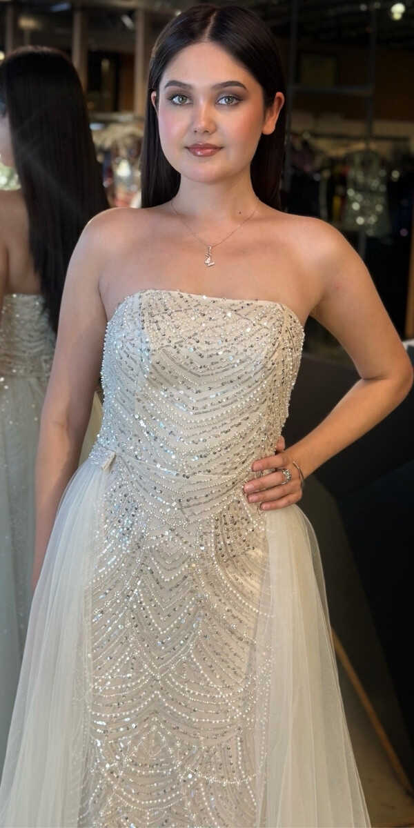 Bej Renk Tül Pelerin Etekli Uzun Abiye Elbise, Pullu Boncuklu Kumaştan Üretilmiş olup Parıltı ve Zarafetin Buluştuğu Kumaş Türü Sizi Işıl Işıl Gösterecektir.