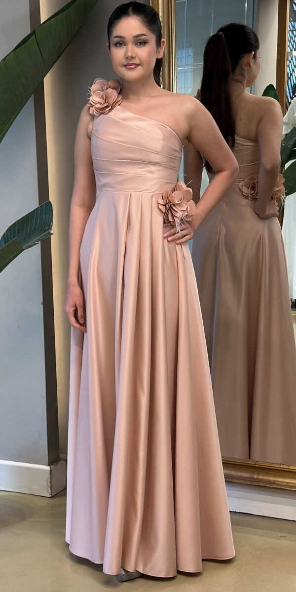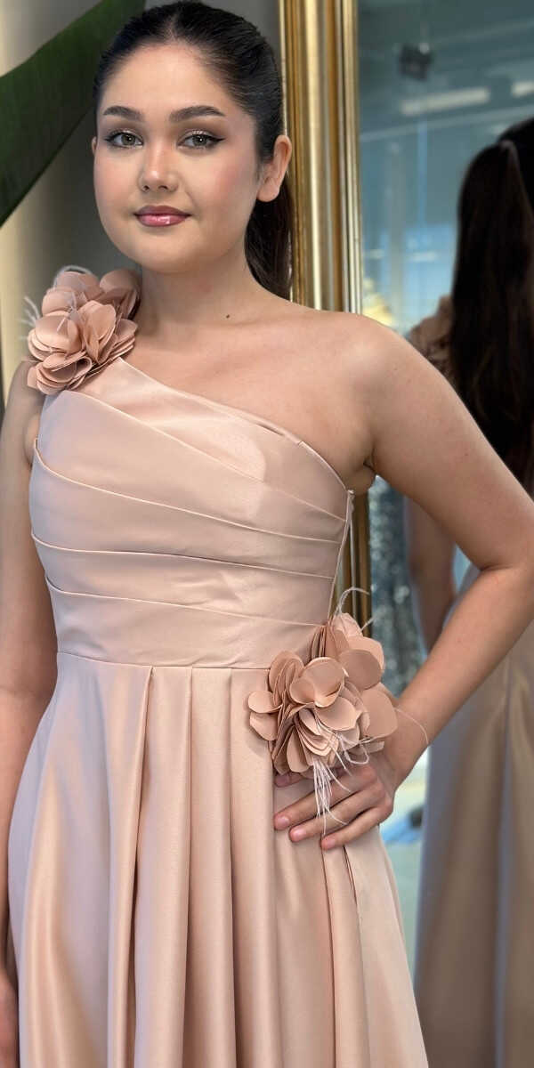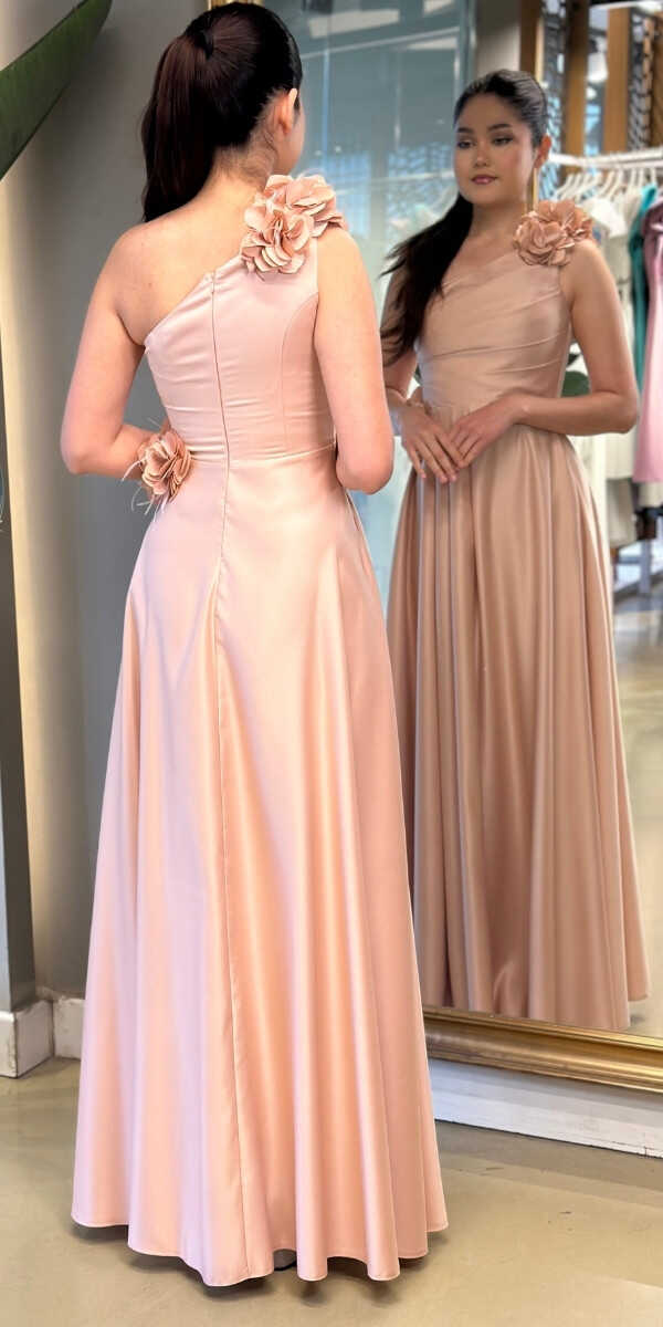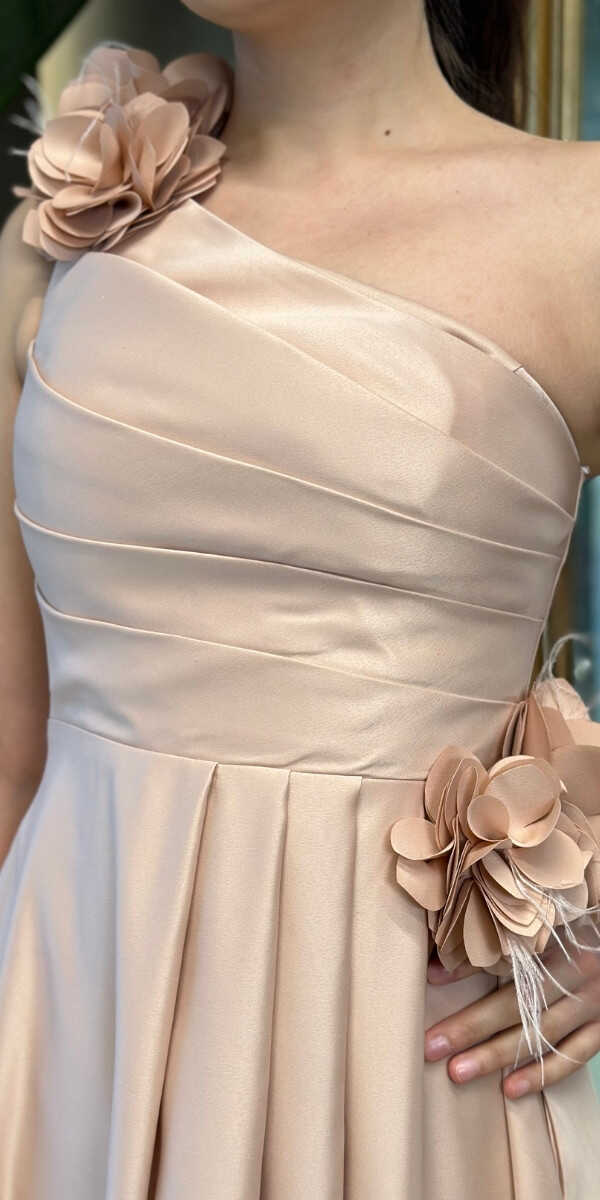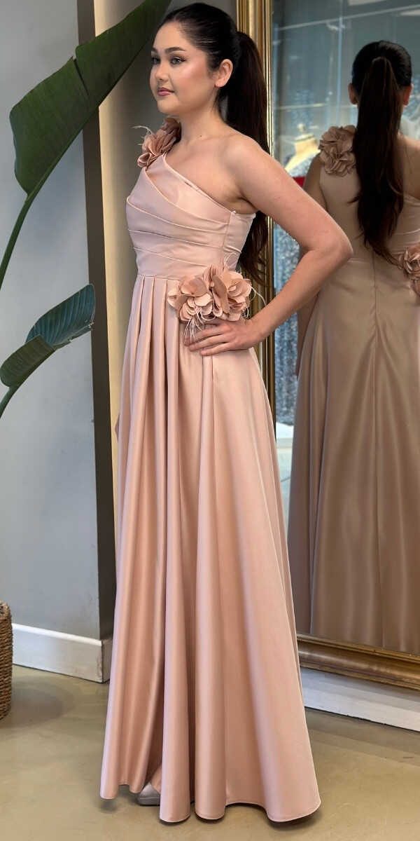 Bej Tek Omuzlu Çiçek Detaylı Kloş Etekli Saten Uzun Abiye Elbise 7659