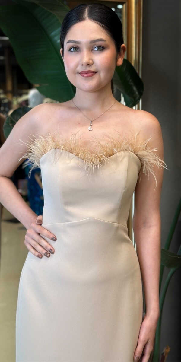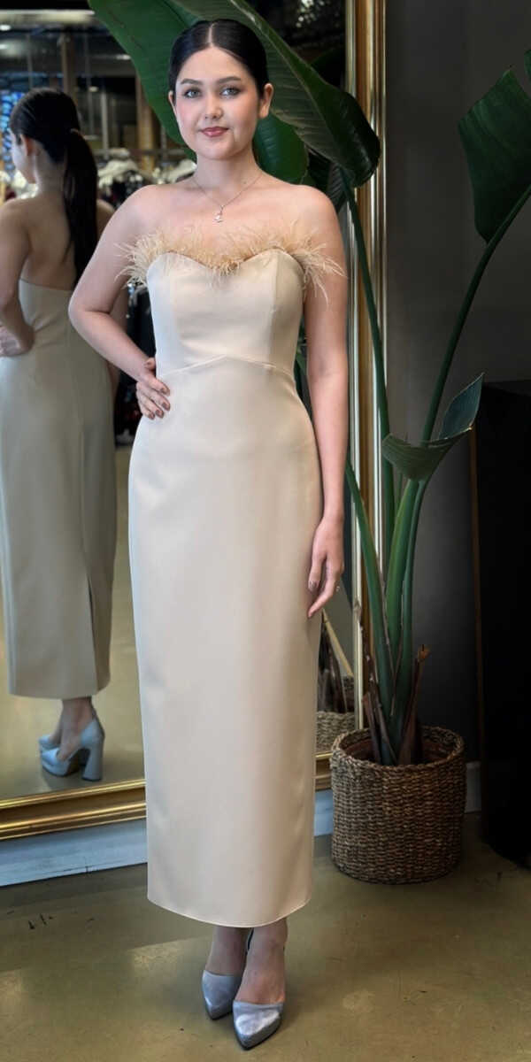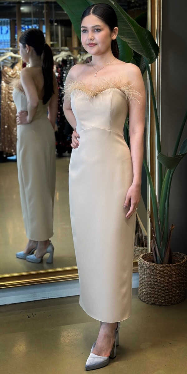 Bej Renk Düz Kesim Midi Abiye Elbise, Krep Kumaştan Üretilmiş olup Hafif Ve Daha Az Kırışan Krep Kumaş Sizi Daha Rahat Hissettirecektir. Uçuşan Tüy Detay Sizi Oldukça Havalı Gösterecek. Yırtmaç Detayı Cesur ve Çarpıcı Bir Stil Sunacaktır.