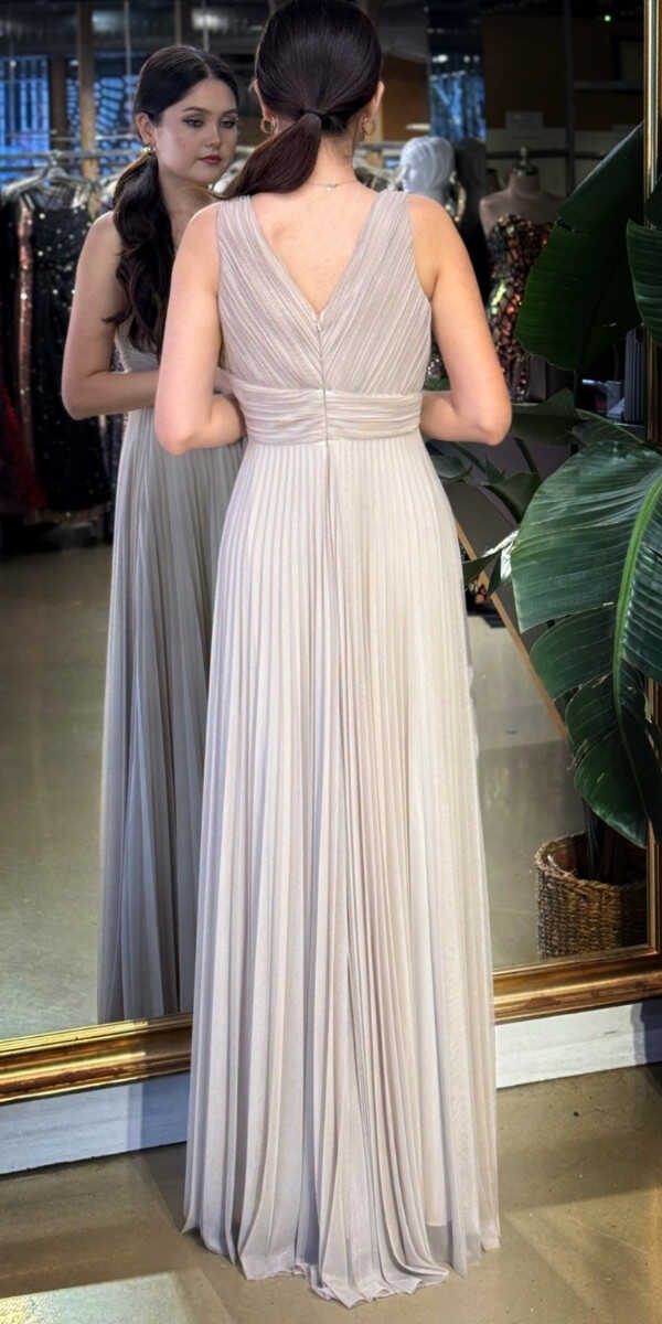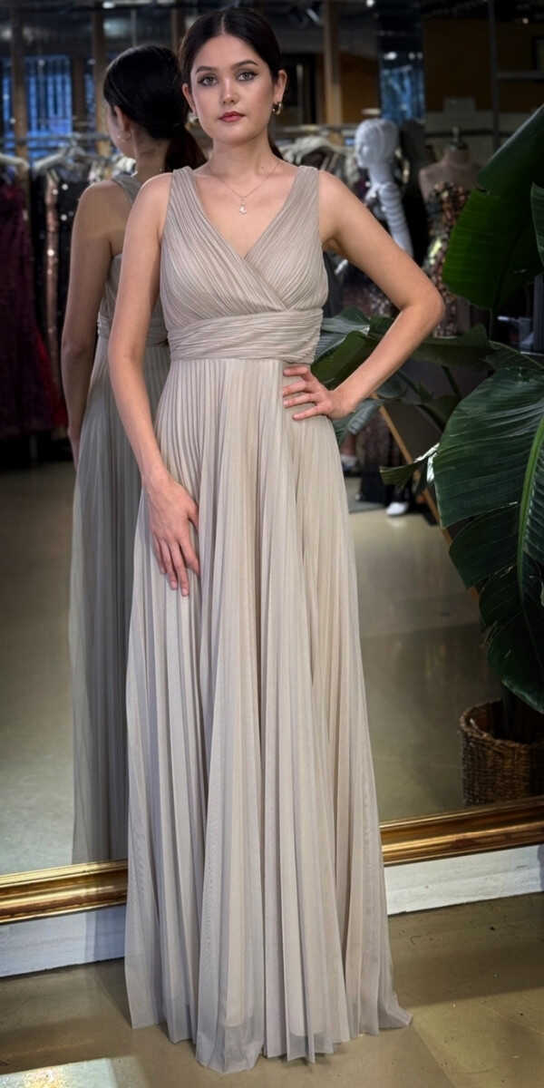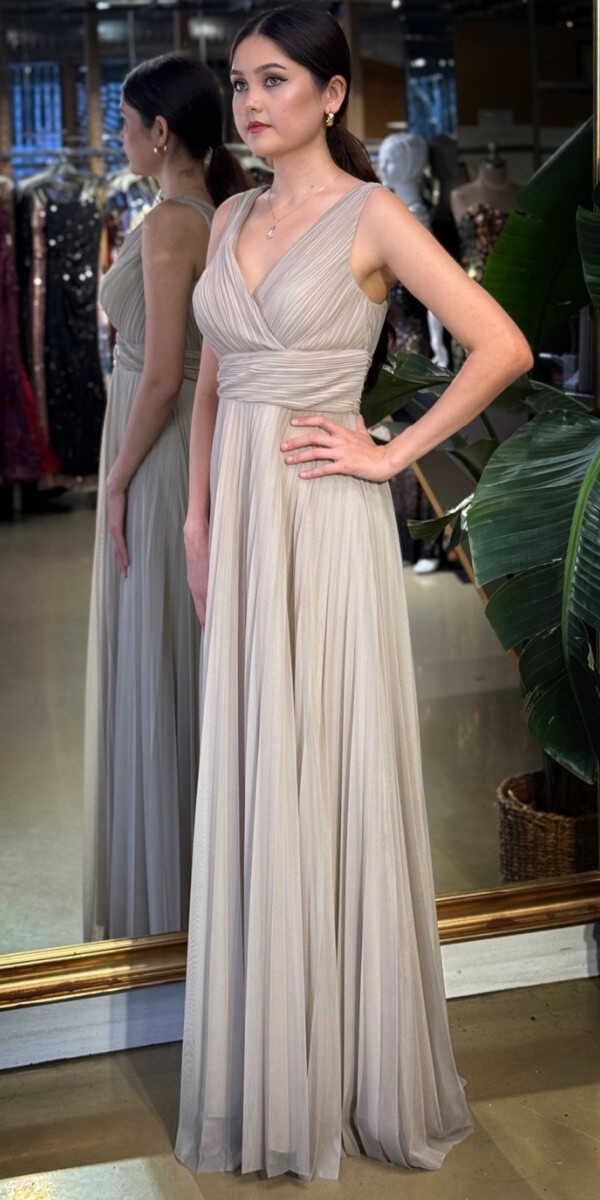 V Yaka Bej Renk Kloş Etekli Uzun Abiye Elbise, Şifon Kumaştan Üretilmiş olup Uçuş Uçuş Şifon Kumaş Tüm Dikkatleri Üzerinize Toplayacaktır. Kalın askılı yapısıyla destekleyici ve modern bir görünüm sağlar.