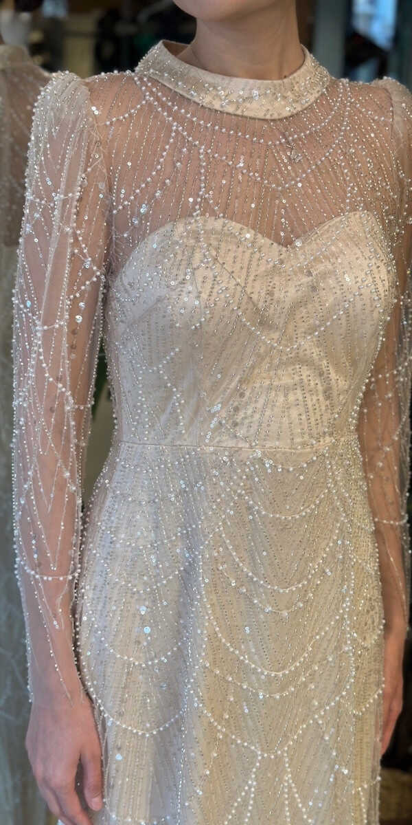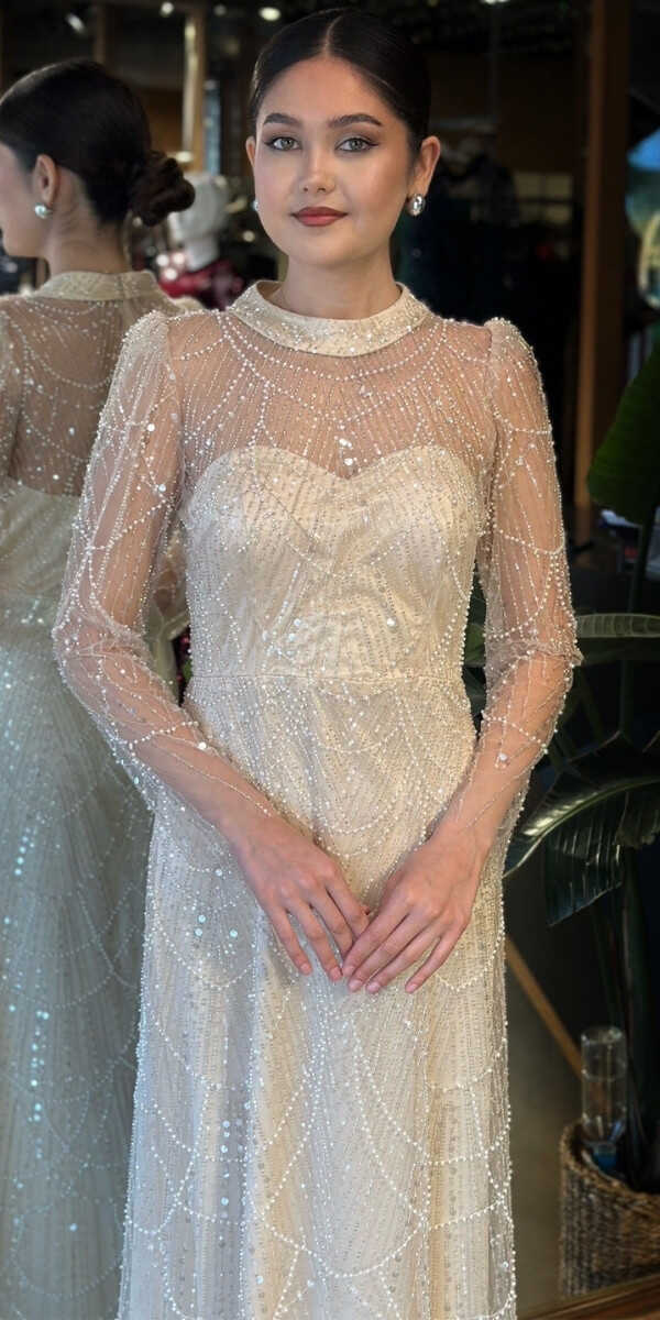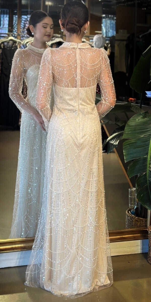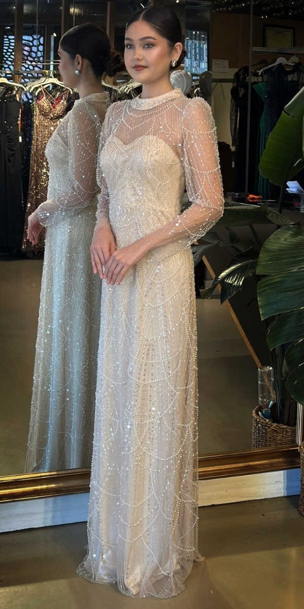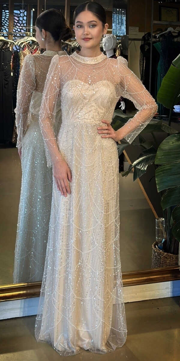 Yuvarlak Yaka Bej Renk Düz Kesim Uzun Abiye Elbise, Pullu Boncuklu Kumaştan Üretilmiş olup Parıltı ve Zarafetin Buluştuğu Kumaş Türü Sizi Işıl Işıl Gösterecektir. Uzun kollarıyla, kollarınızı zarif bir şekilde kapatır.