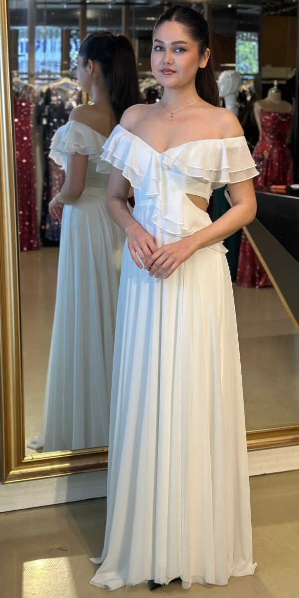 Beyaz Düşük Kollu Bel Dekolteli Uzun Abiye Elbise 3359