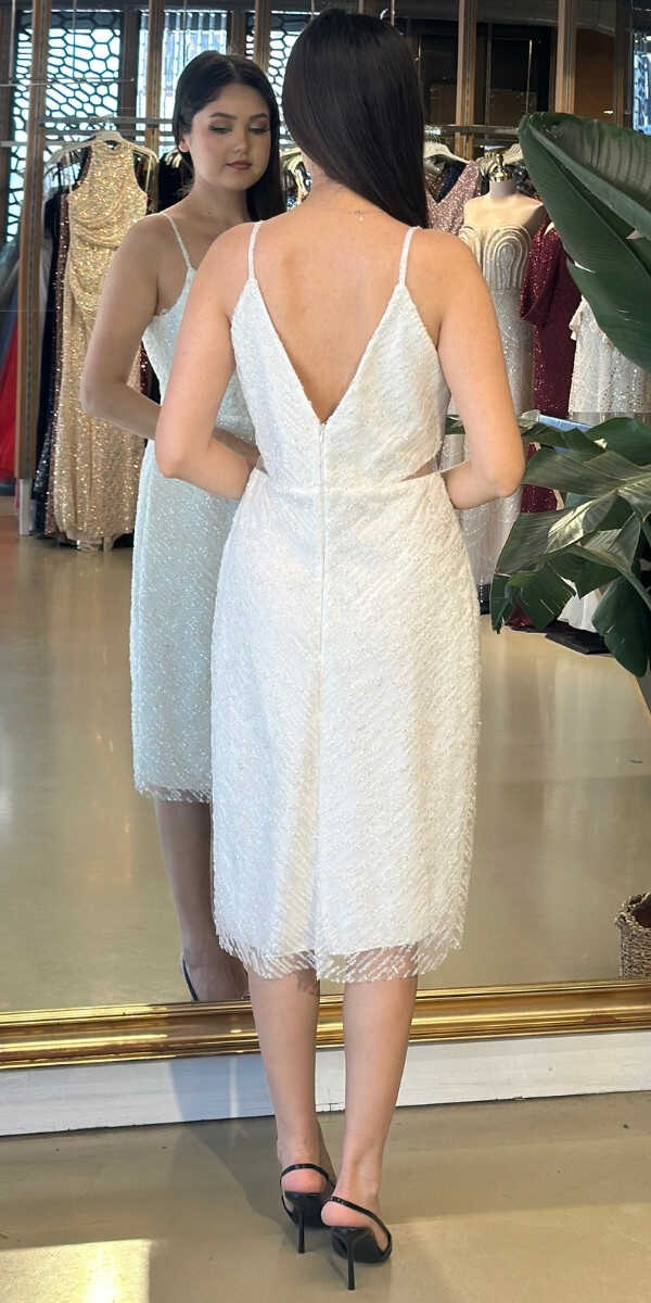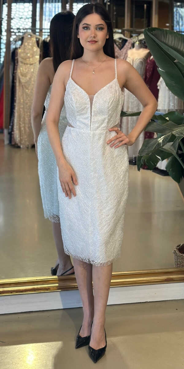 Beyaz İp Askılı Bel Dekolteli Düz Kesim Simli Midi Abiye Elbise 7129