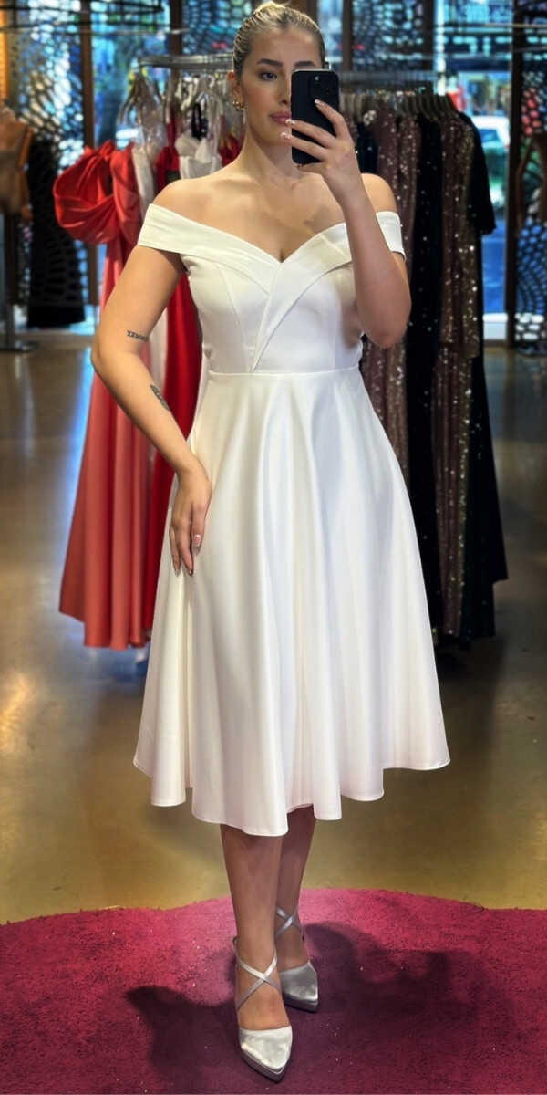 Beyaz Renk Kloş Etekli Midi Abiye Elbise, Saten Kumaştan Üretilmiş Olup Satenin Pürüzsüz Işığı Görünümünüze Zarafet Katacaktır.