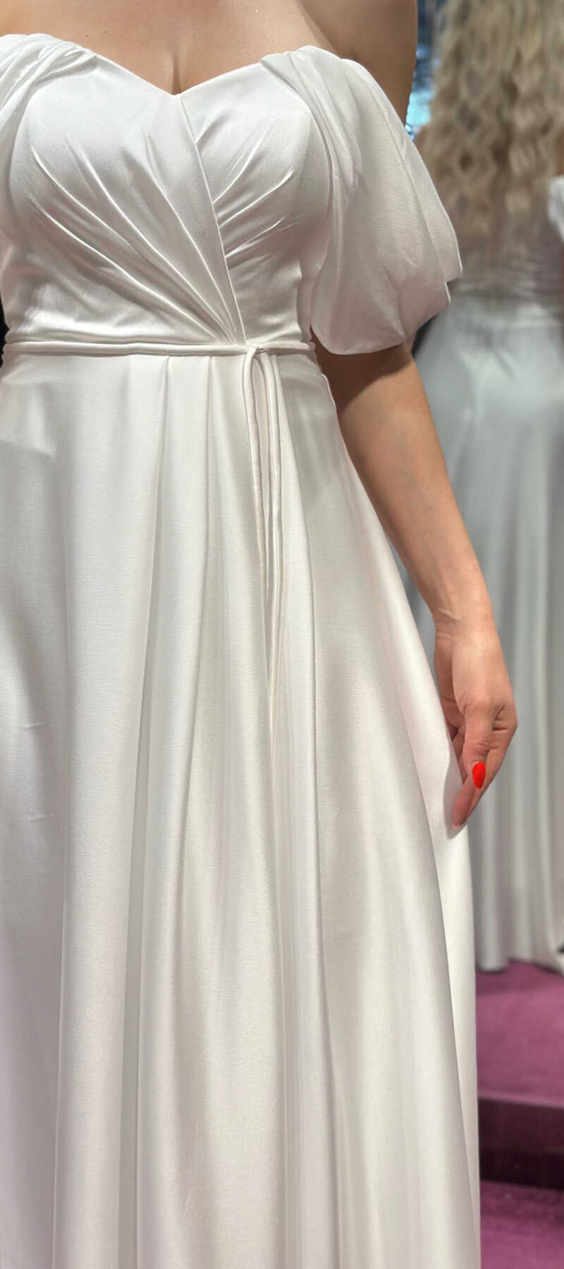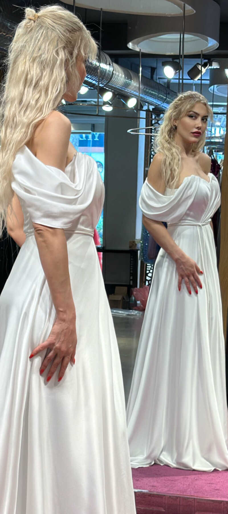 Beyaz Renk Kloş Etekli Uzun Abiye Elbise, Saten Kumaştan Üretilmiş Olduğundan Satenin Pürüzsüz Işığı Görünümünüze Zarafet Katacaktır.