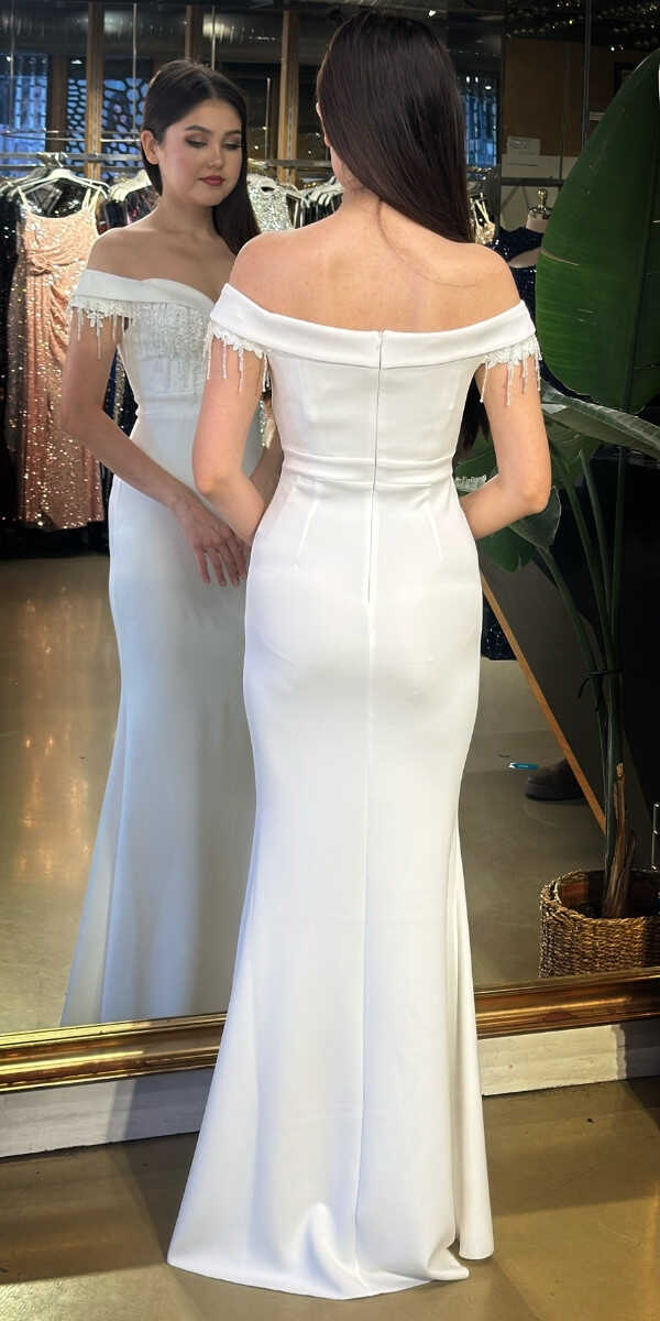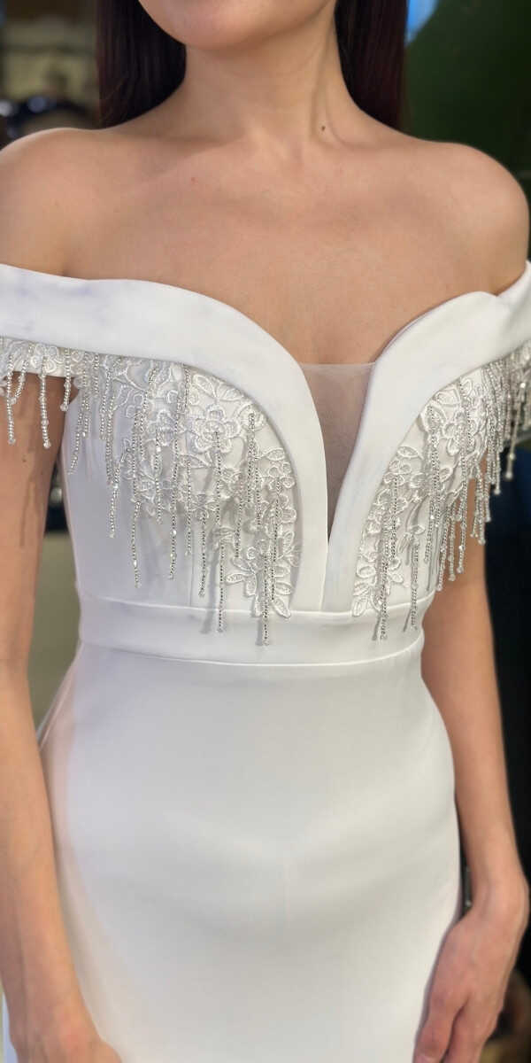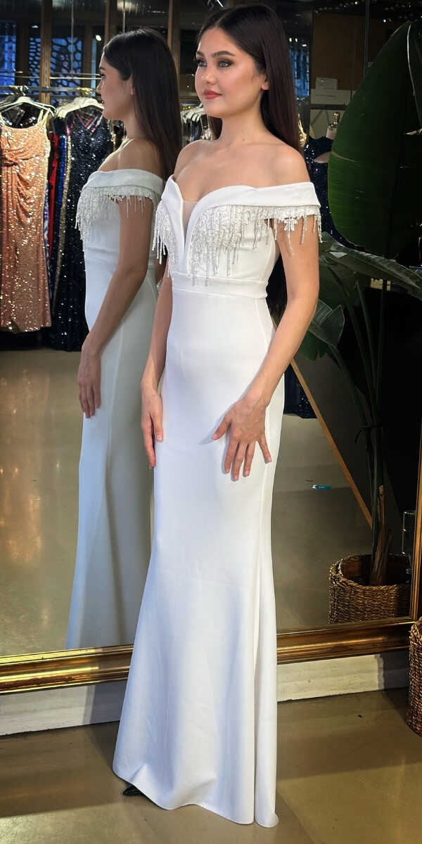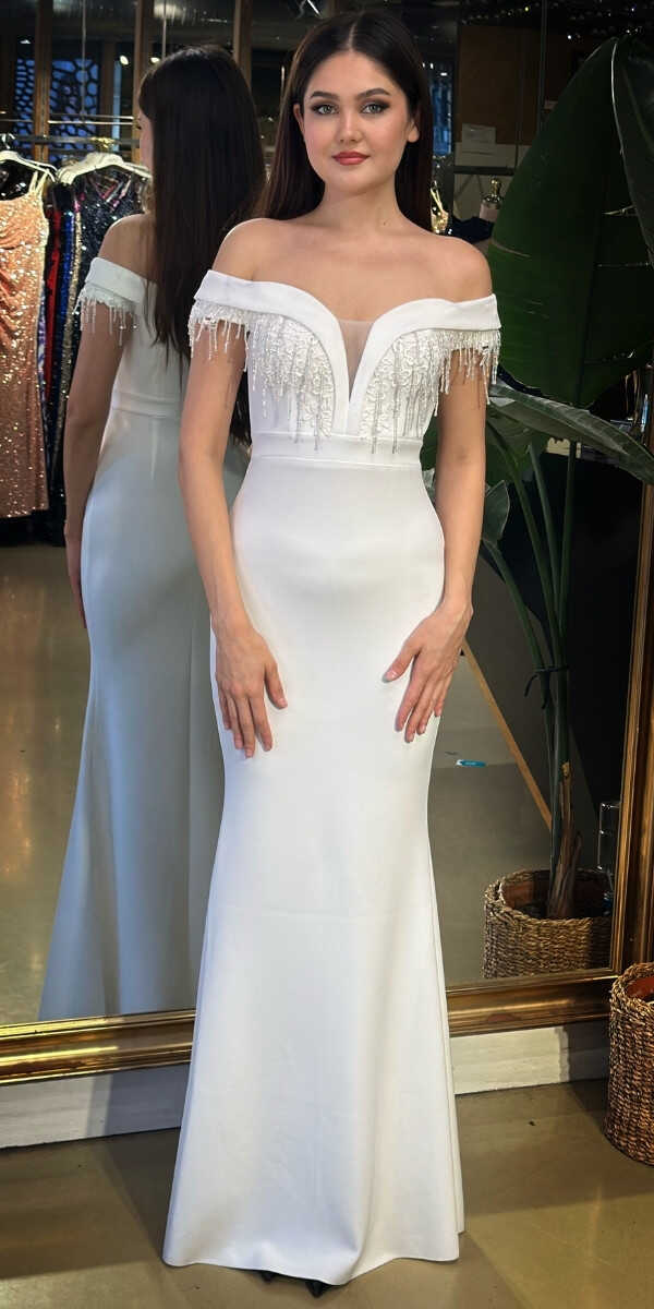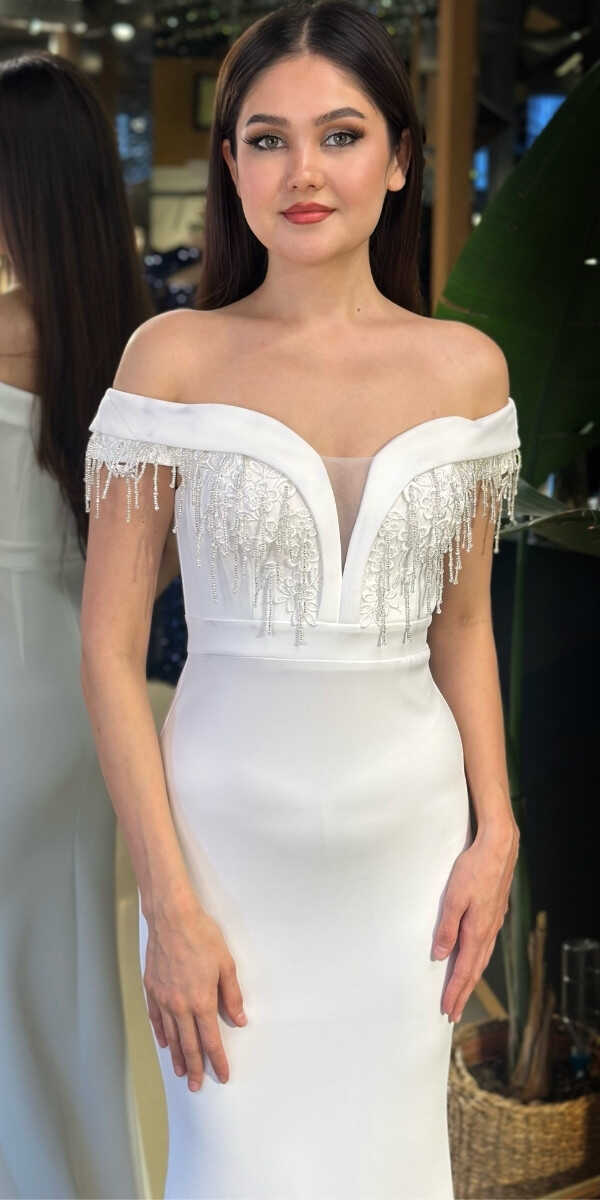 Madonna Yaka Beyaz Renk Düz Kesim Uzun Abiye Elbise, Krep Kumaştan Üretilmiş olup Hafif Ve Daha Az Kırışan Krep Kumaş Sizi Daha Rahat Hissettirecektir. Boncuk süslemeleriyle her adımda ışıldar.