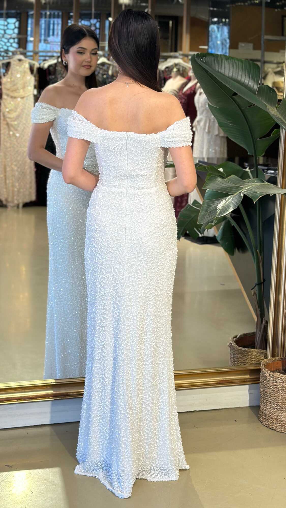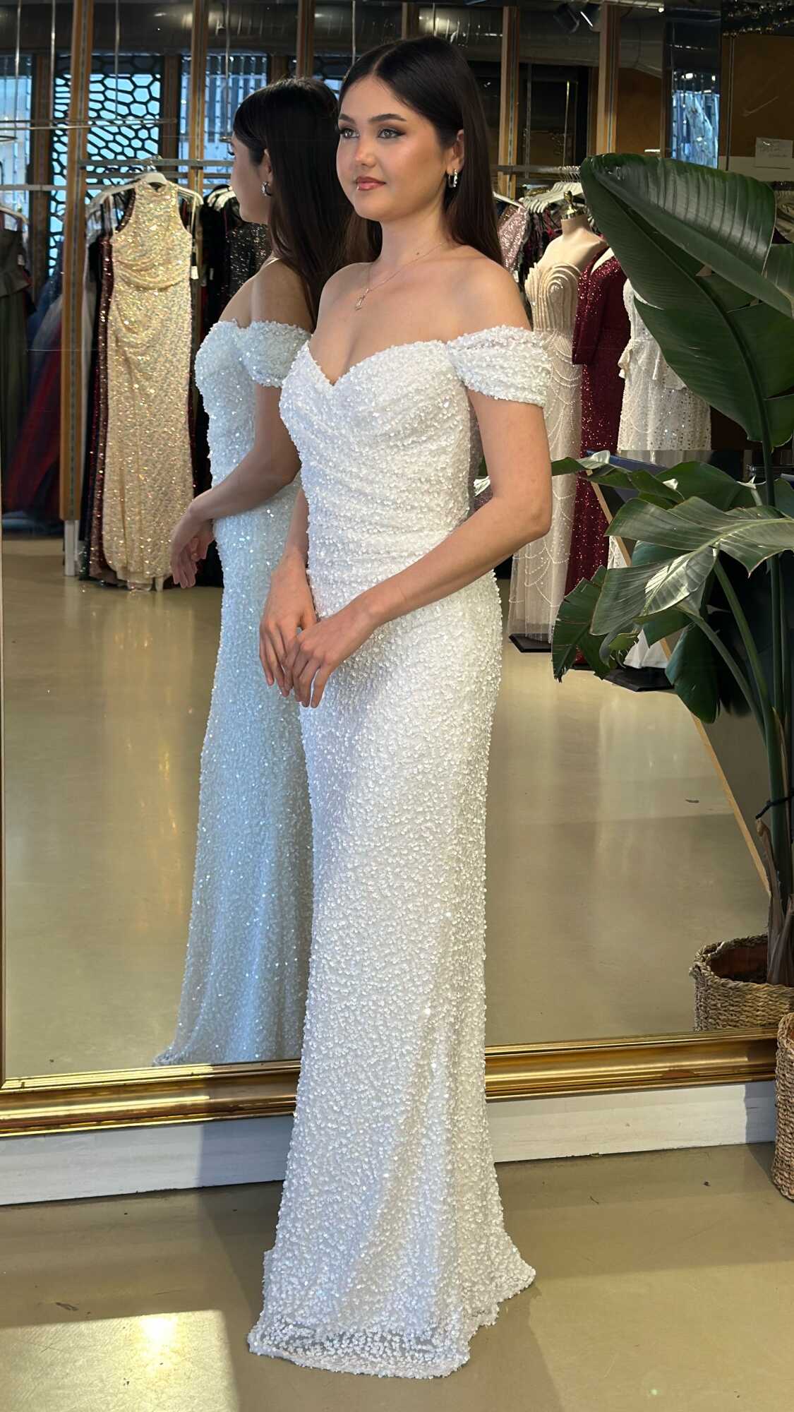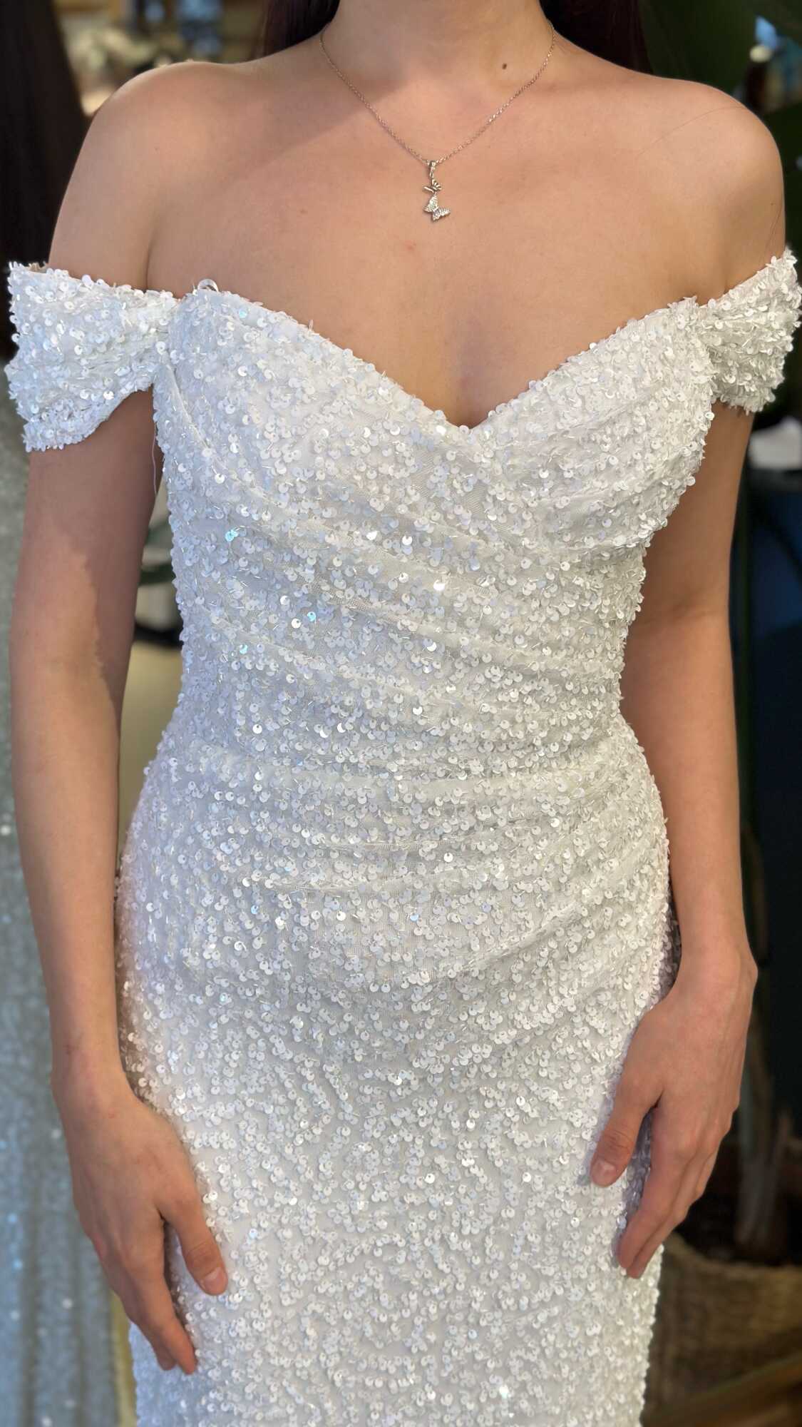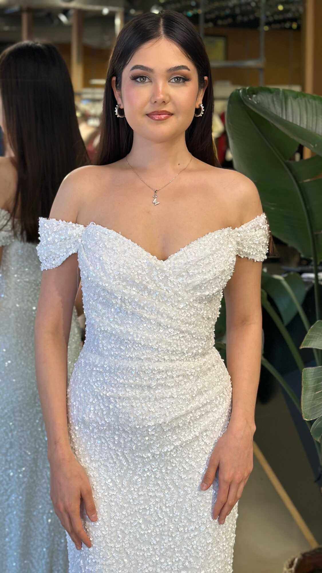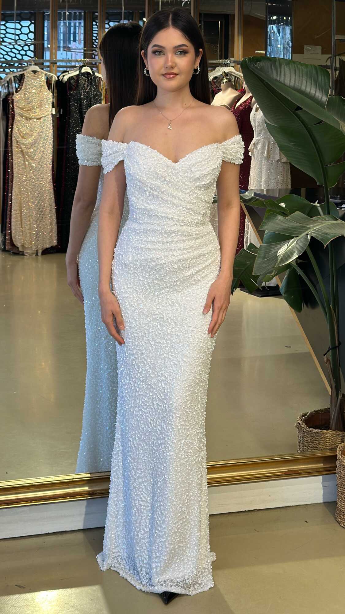 Madonna Yaka Beyaz Renk Düz Kesim Uzun Abiye Elbise, Payet Kumaştan Üretilmiş olup Pırıltısıyla Göz Kamaştıracaktır. Vücuda uyum sağlayan likralı kumaş, dinamik bir duruş kazandırır.