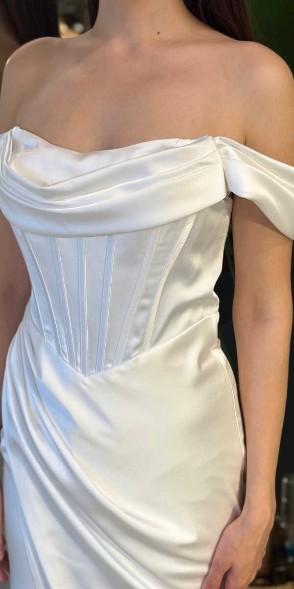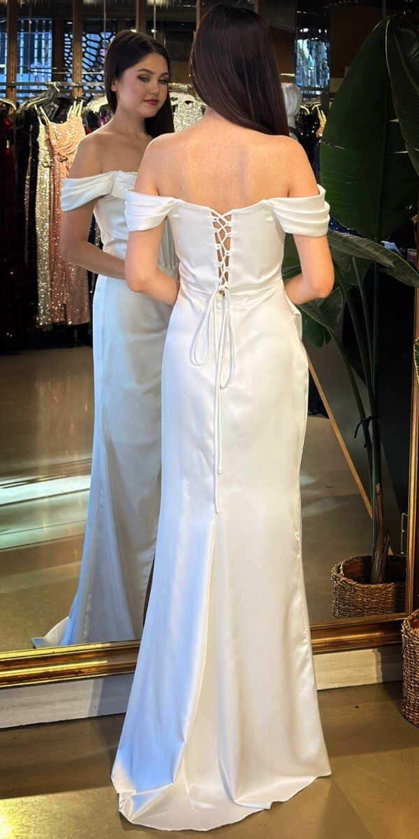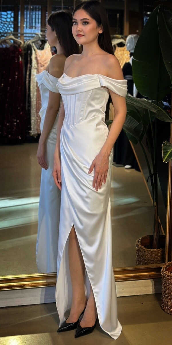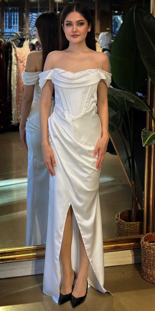 Gelince Haber VerMadonna Yaka Beyaz Renk Düz Kesim Uzun Abiye Elbise, Saten Kumaştan Üretilmiş olup Satenin Pürüzsüz Işığı Görünümünüze Zarafet Katacaktır. Şık Sırt Dekoltesi Size Çok Yakışacak. Yırtmaç Detayı Cesur ve Çarpıcı Bir Stil Sunacaktır.