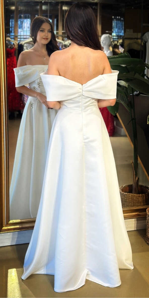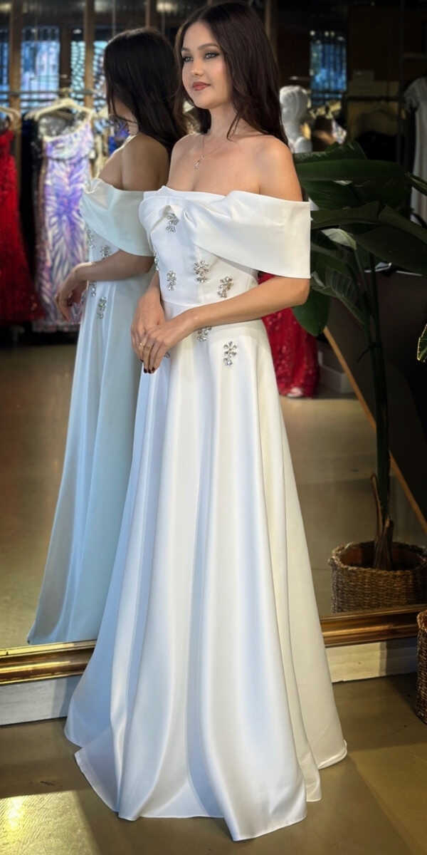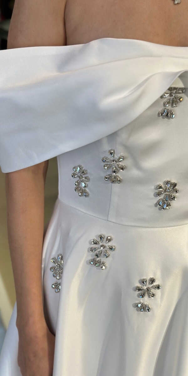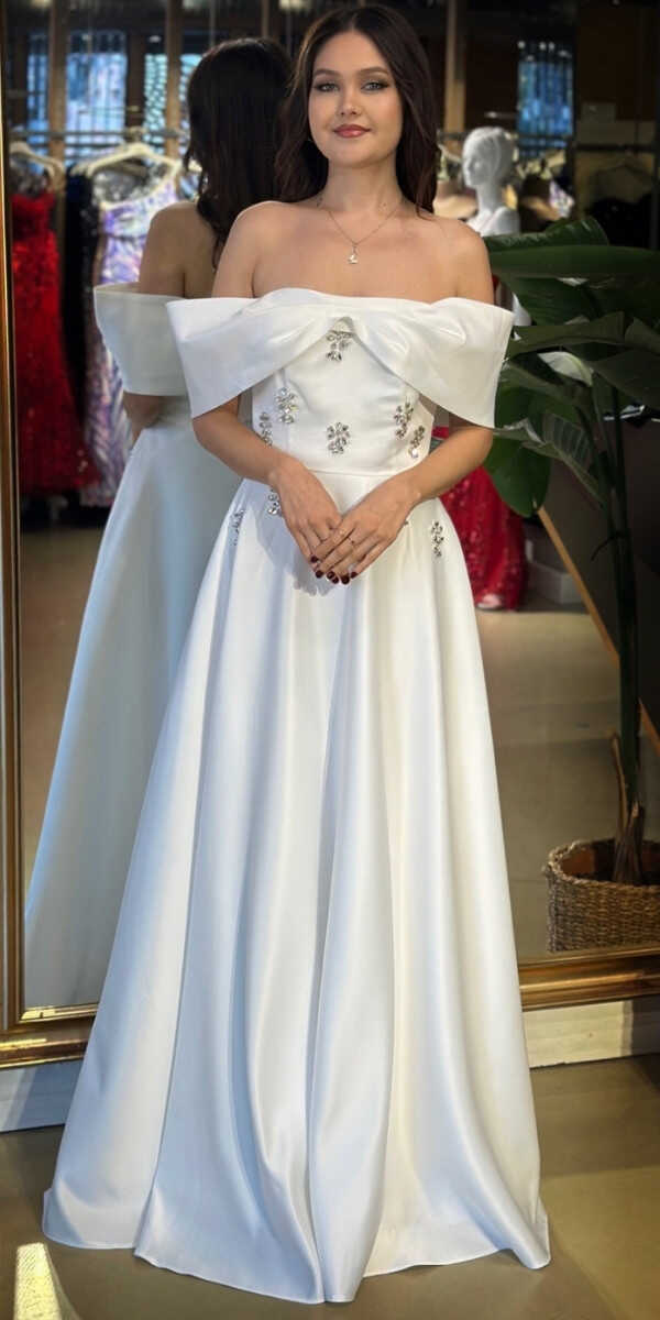 Madonna Yaka Beyaz Renk Kloş Etekli Uzun Abiye Elbise, Saten Kumaştan Üretilmiş olup Satenin Pürüzsüz Işığı Görünümünüze Zarafet Katacaktır. Taşlı Aksesuar Dikkatleri Üzerinizde Toplayacak.