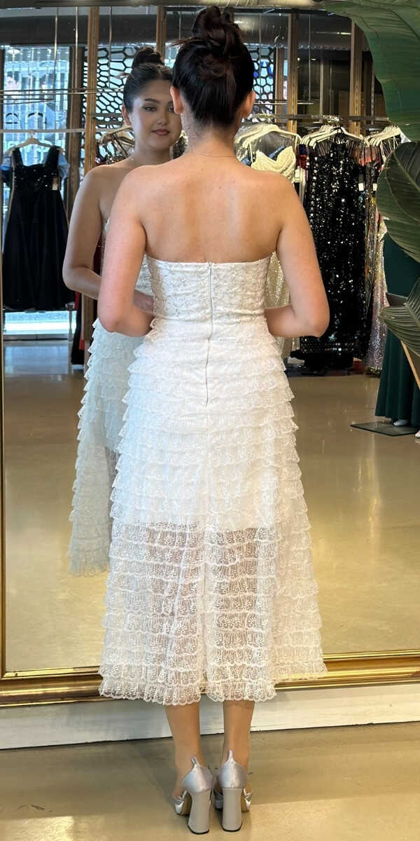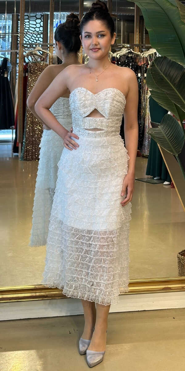 Beyaz Starplez Bel Dekolteli Kısa Abiye Elbise 7709