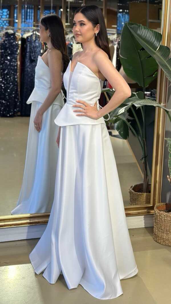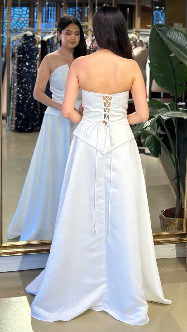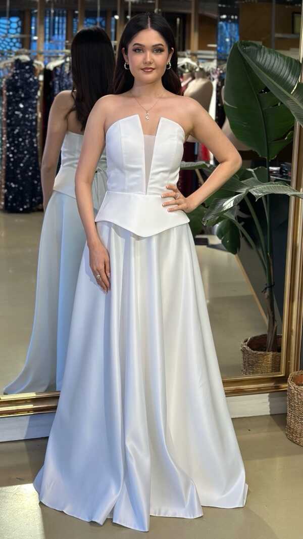 Straplez Yaka Beyaz Renk Kloş Etekli Uzun Abiye Elbise, Saten Kumaştan Üretilmiş olup Satenin Pürüzsüz Işığı Görünümünüze Zarafet Katacaktır. Zarif göğüs dekoltesiyle dengeli bir çekicilik oluşturur.