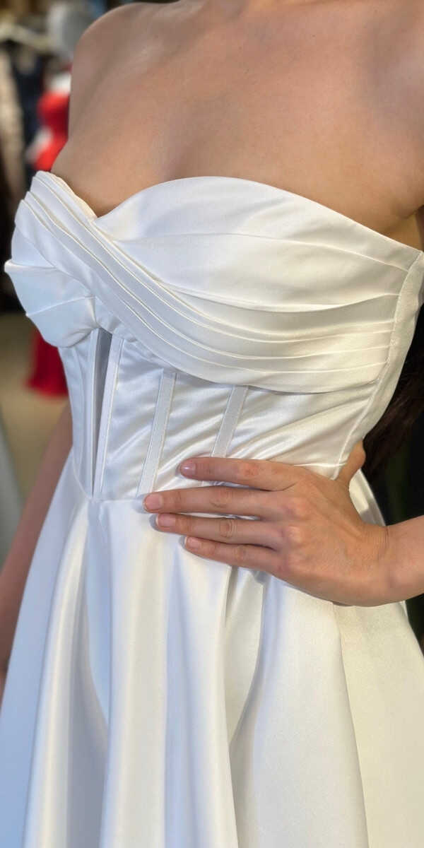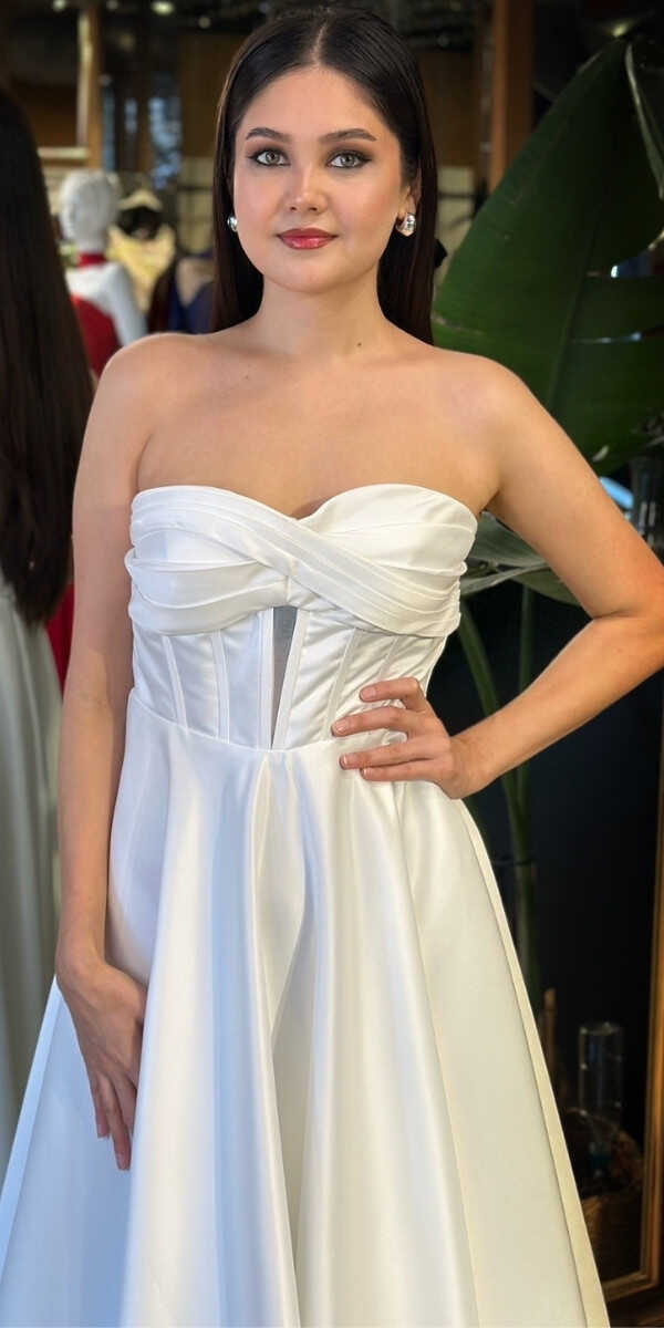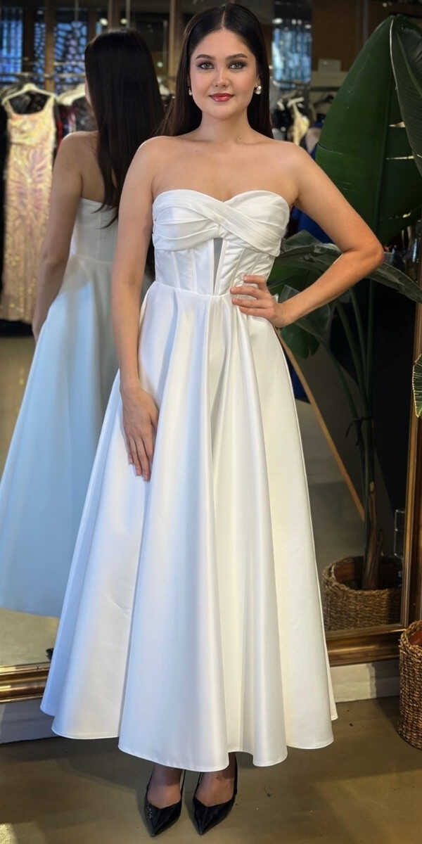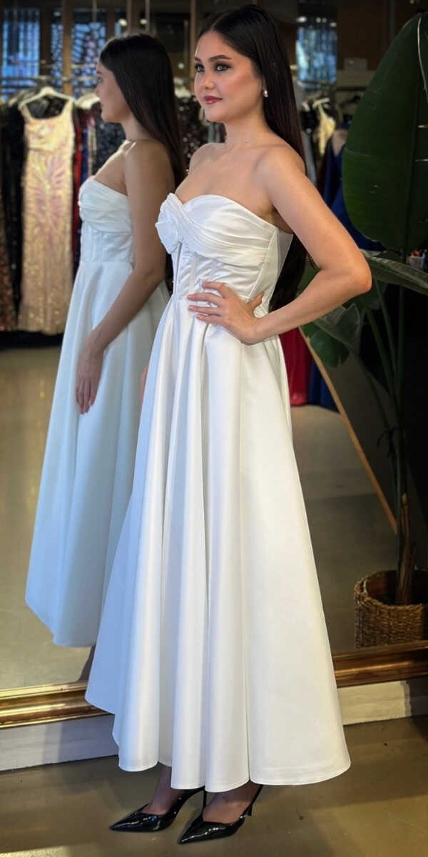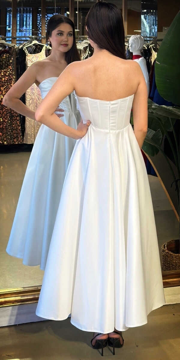 Straplez Yaka Beyaz Renk Kloş Etekli Midi Abiye Elbise, Saten Kumaştan Üretilmiş olup Satenin Pürüzsüz Işığı Görünümünüze Zarafet Katacaktır.