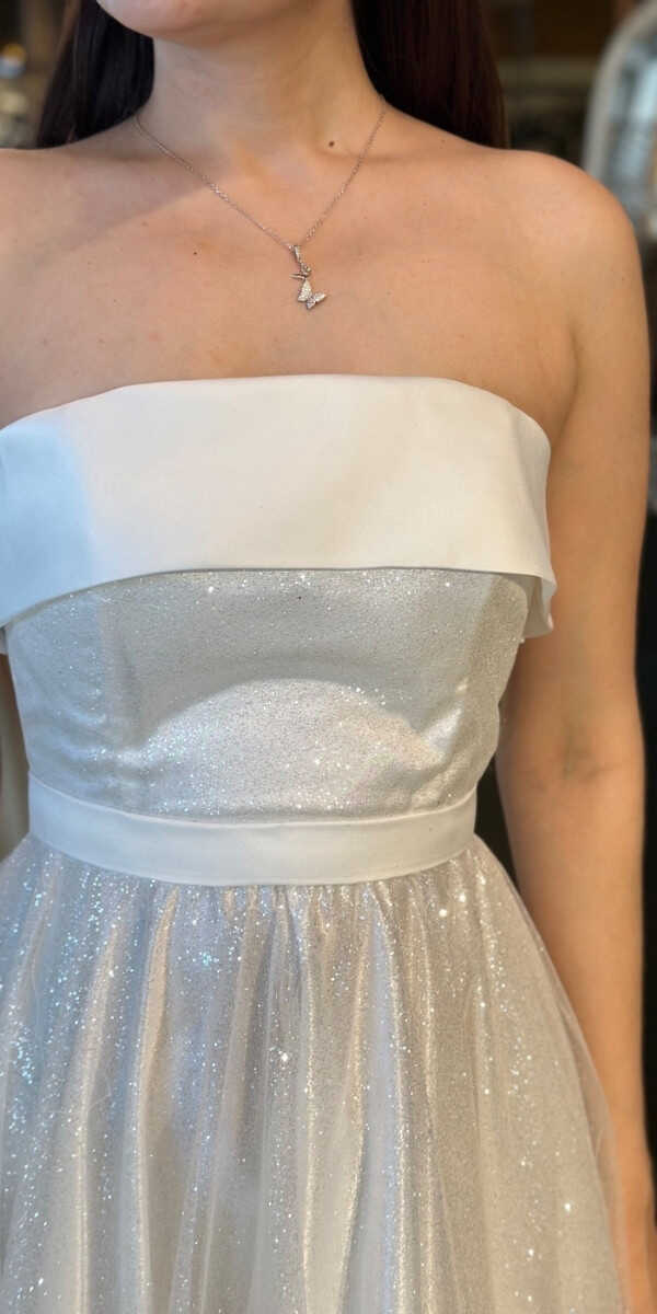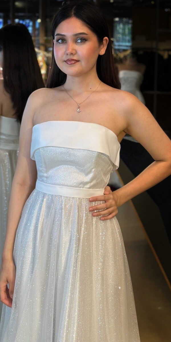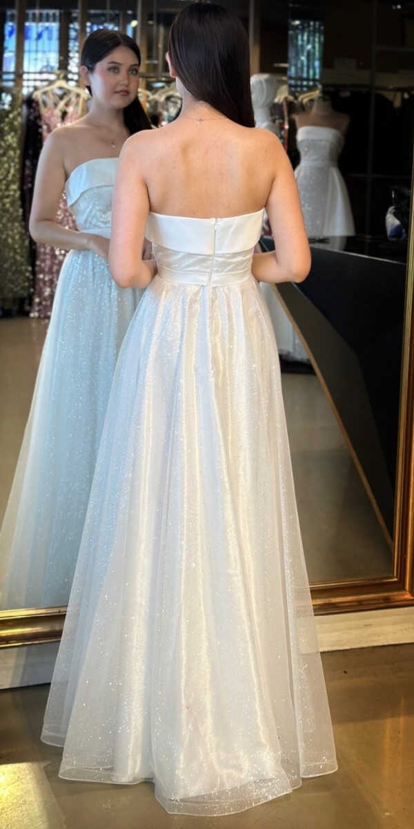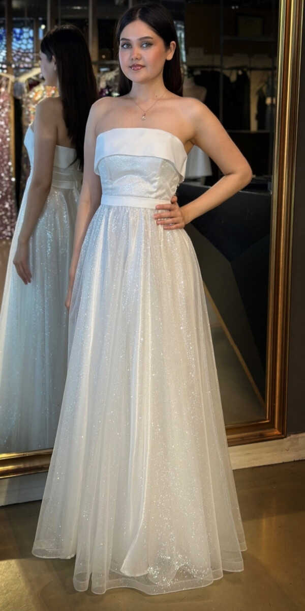Beyaz Renk Kloş Etekli Uzun Abiye Elbise, Tül Kumaştan Üretilmiş olup Hafif Olmasından Kaynaklı Sizi Gece Boyu Rahat Hissettirecek.