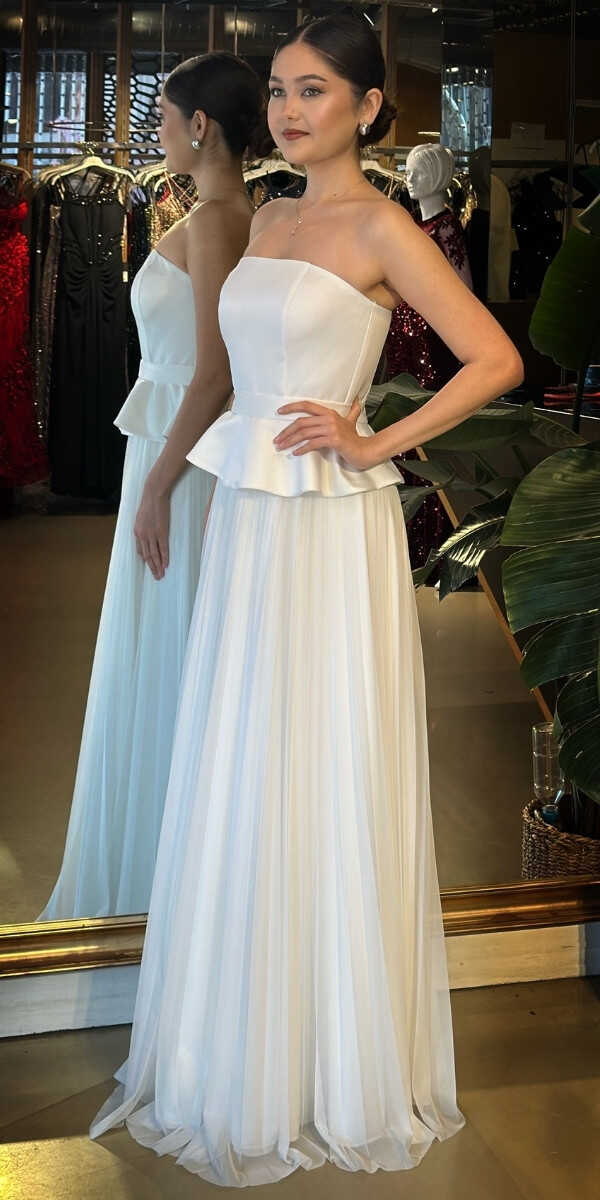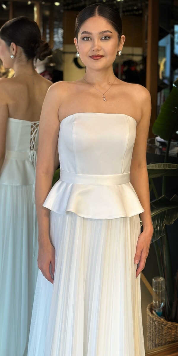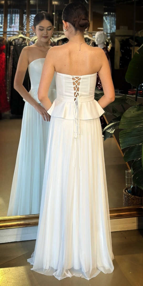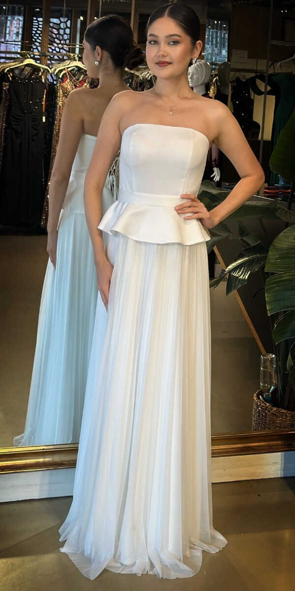 Straplez Yaka Beyaz Renk Kloş Etekli Uzun Abiye Elbise, Şifon Kumaştan Üretilmiş olup Uçuş Uçuş Şifon Kumaş Tüm Dikkatleri Üzerinize Toplayacaktır. Şık Sırt Dekoltesi Size Çok Yakışacak.