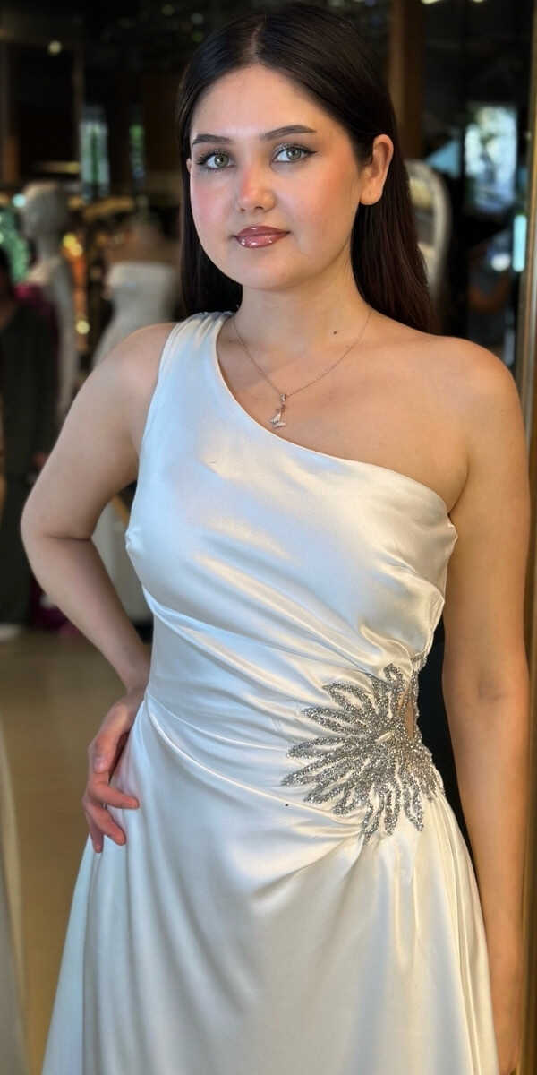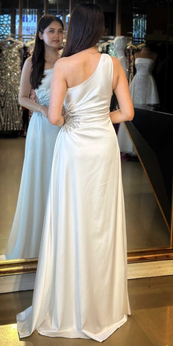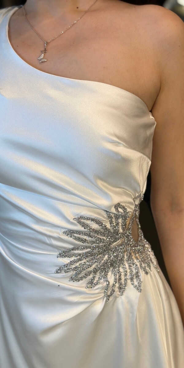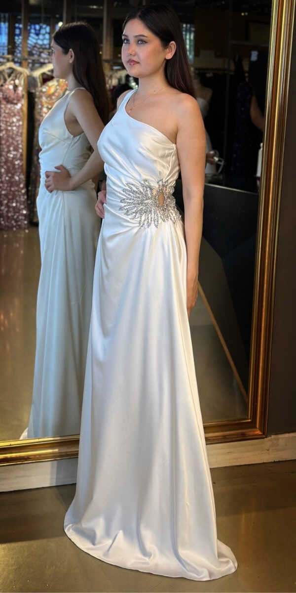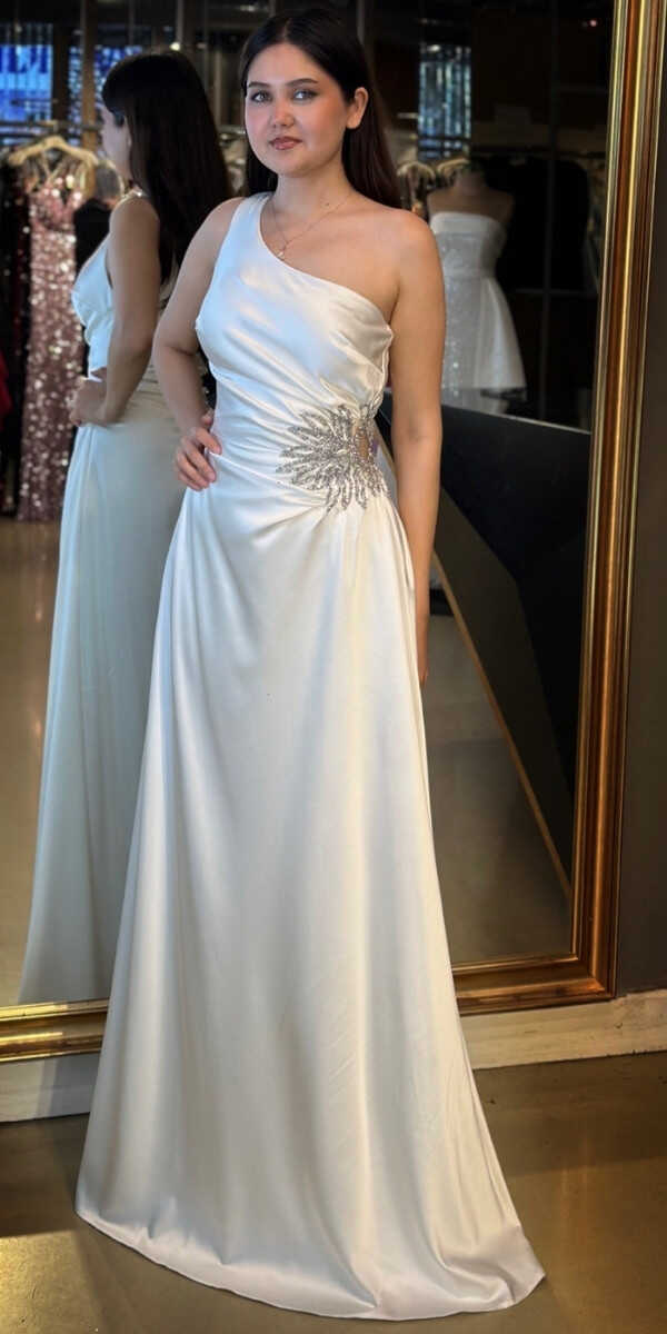 Beyaz Renk Düz Kesim Uzun Abiye Elbise, Saten Kumaştan Üretilmiş olup Satenin Pürüzsüz Işığı Görünümünüze Zarafet Katacaktır. Taşlı Aksesuar Dikkatleri Üzerinizde Toplayacak