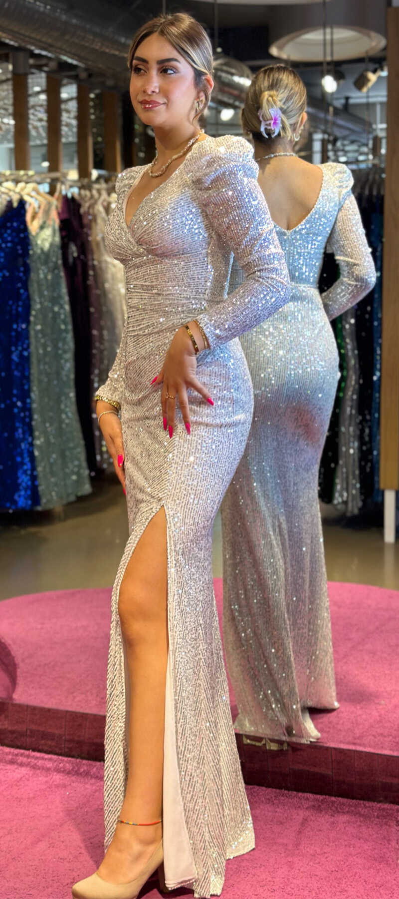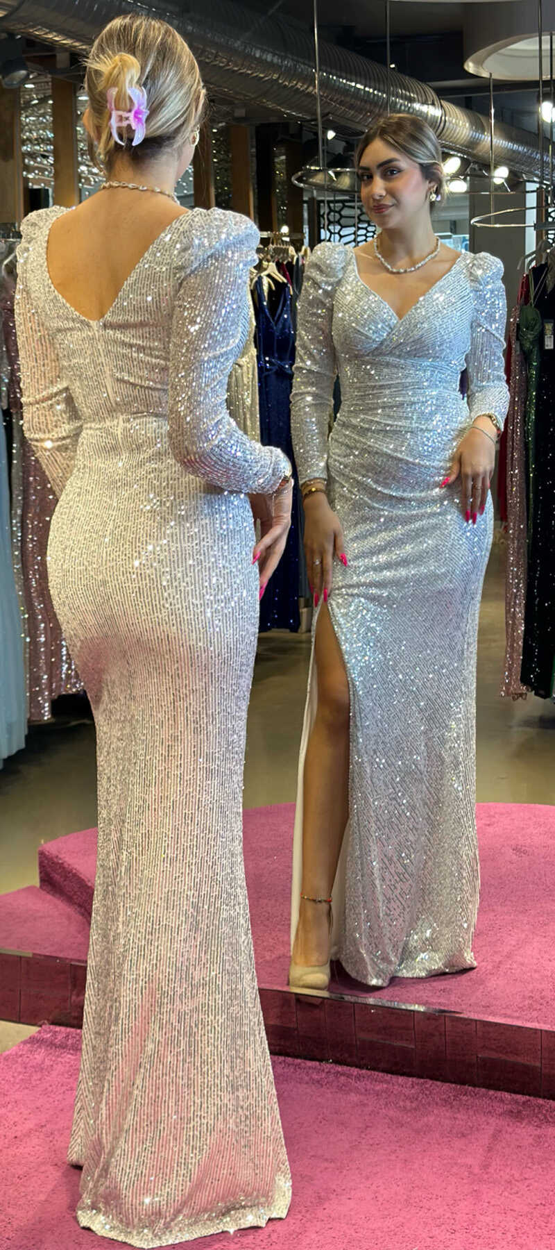 Beyaz Renk Düz Kesim Uzun Abiye Elbise, Payet Kumaştan Üretilmiş Olup Pırıltısıyla Göz Kamaştıracaktır.Yırtmaç Detayı Cesur ve Çarpıcı Bir Stil Sunacaktır.
