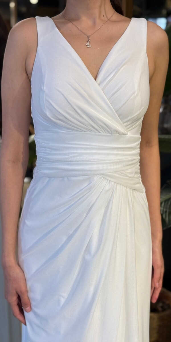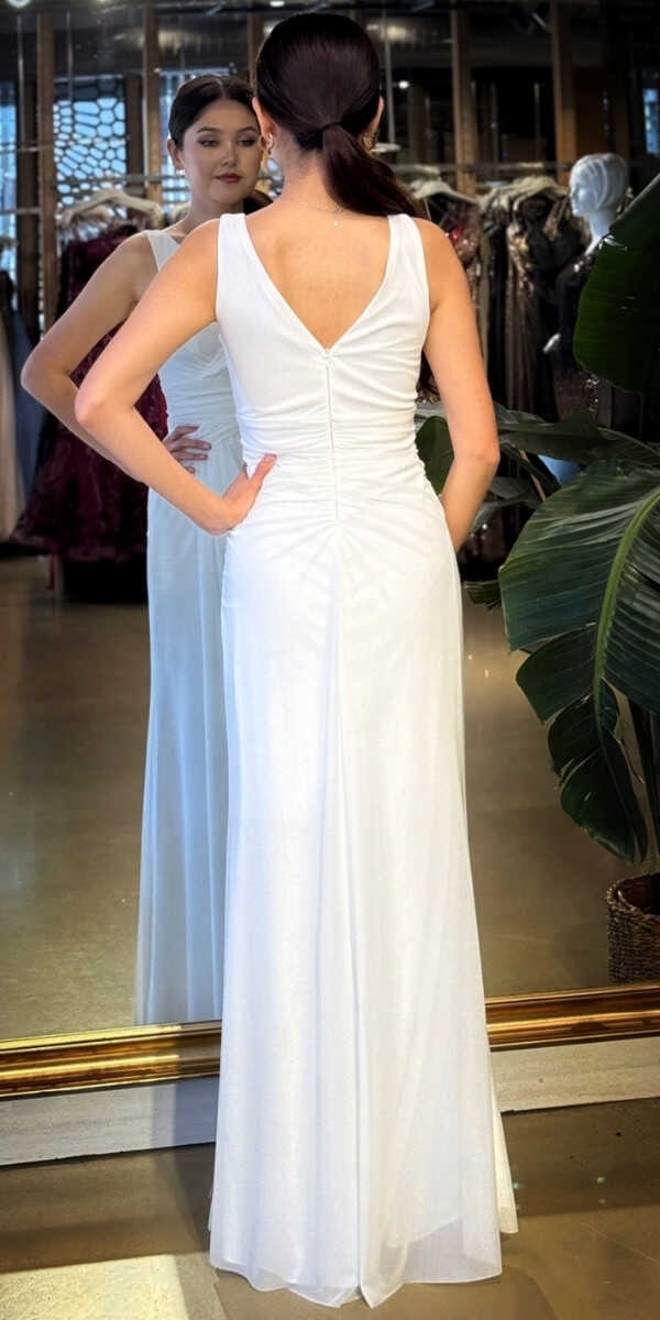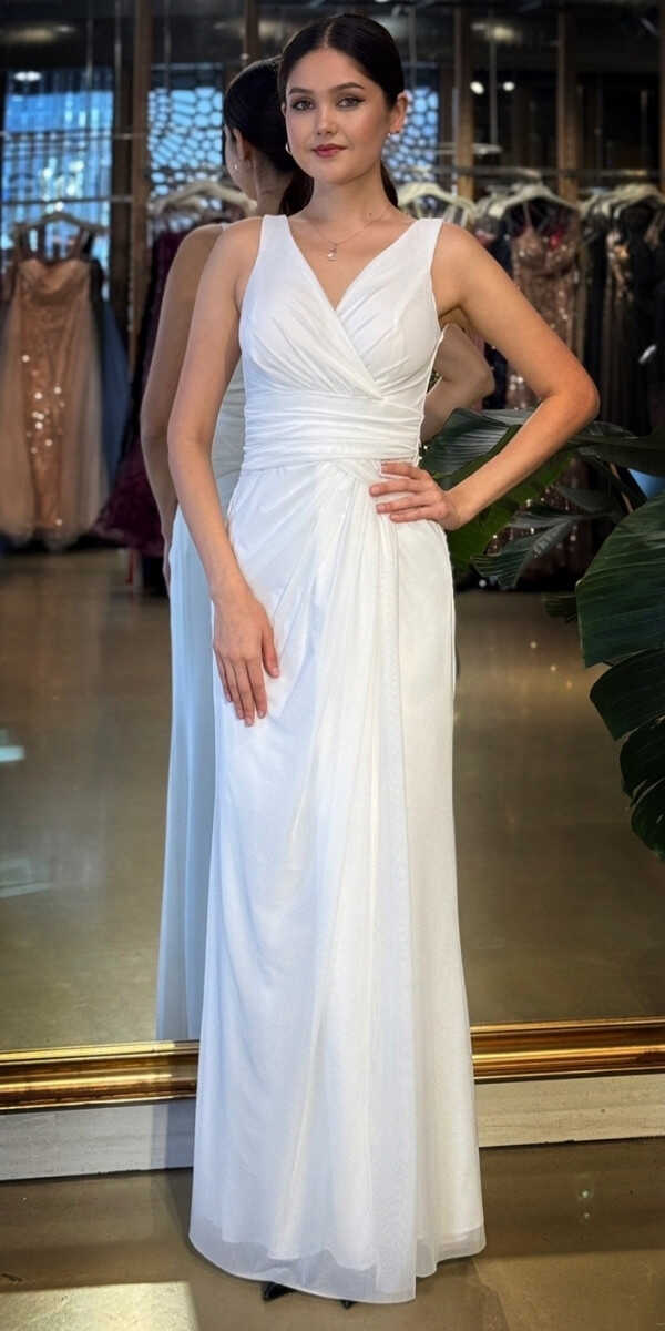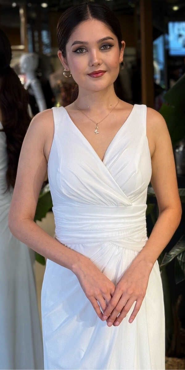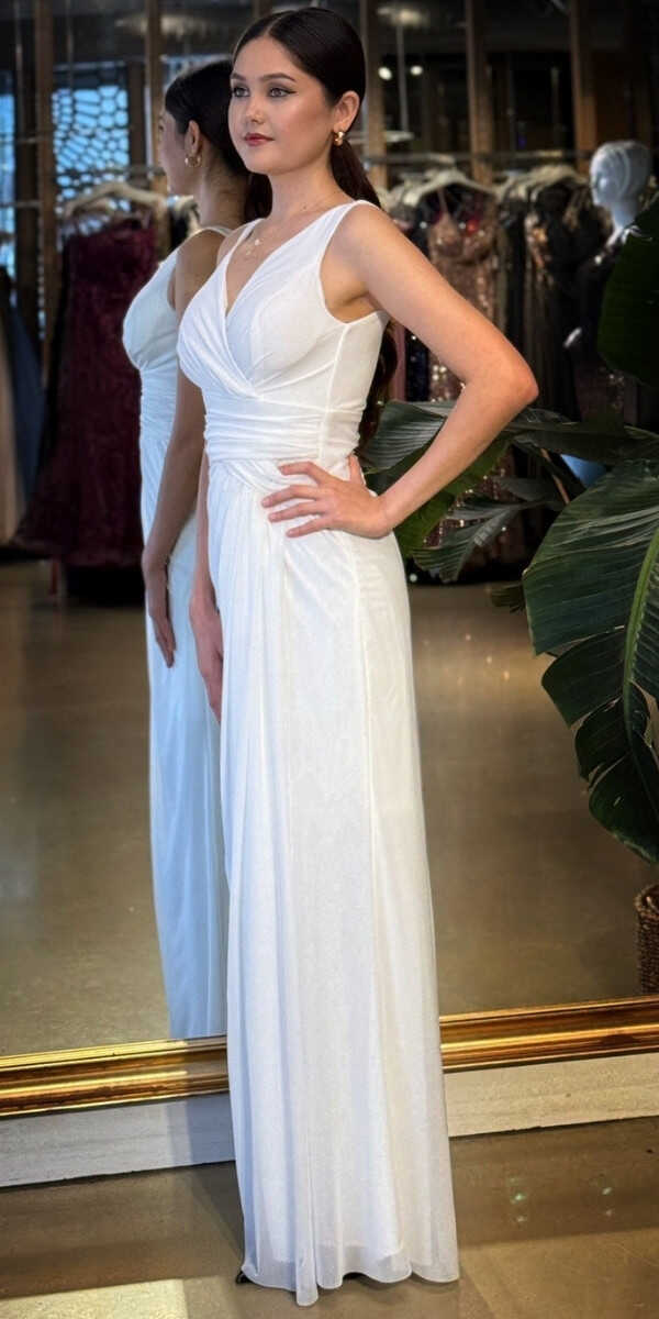 V Yaka Beyaz Renk Düz Kesim Uzun Abiye Elbise, Tül Kumaştan Üretilmiş olup Hafif Olmasından Kaynaklı Sizi Gece Boyu Rahat Hissettirecek. Vücuda uyum sağlayan likralı kumaş, dinamik bir duruş kazandırır. Kalın askılı yapısıyla destekleyici ve modern bir görünüm sağlar. Adeta Göz Kamaştıran Bir Görünüm Yaratacak.