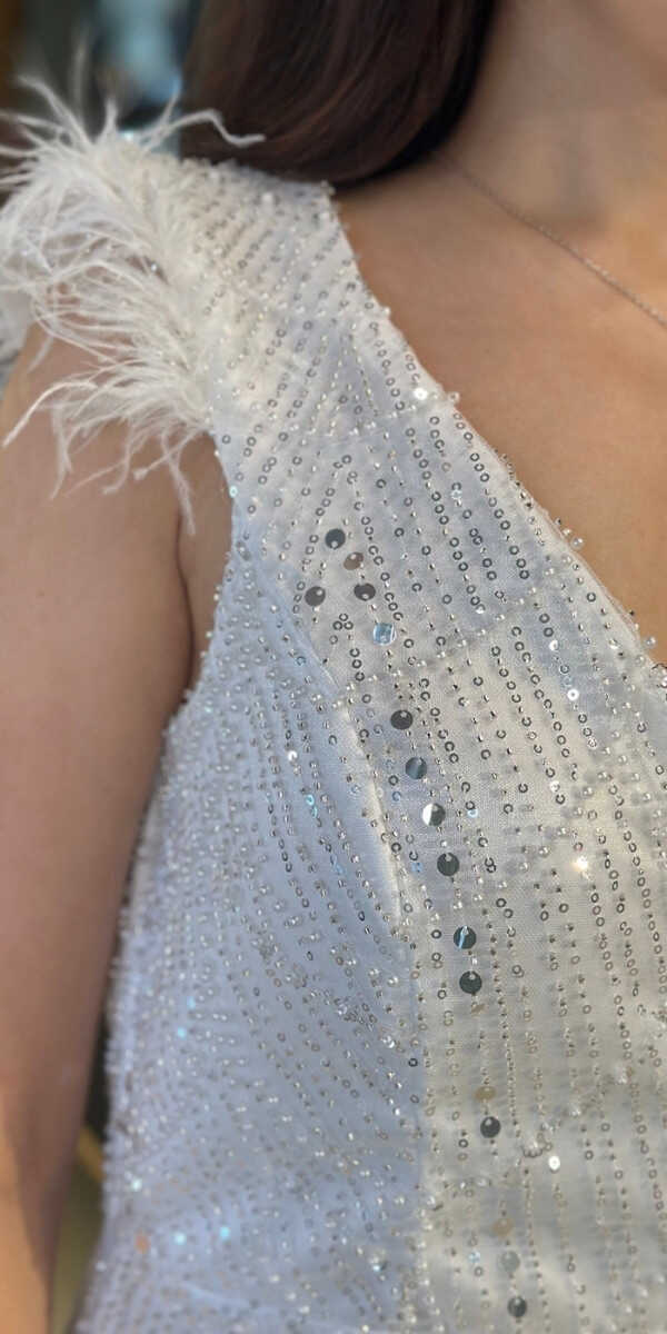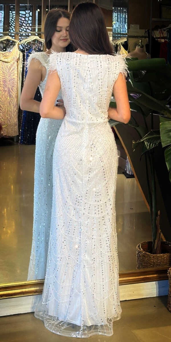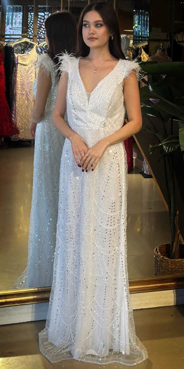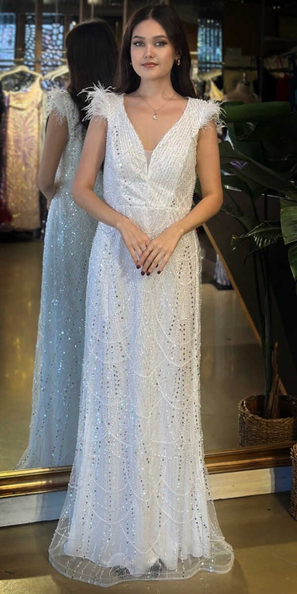 V Yaka Beyaz Renk Düz Kesim Uzun Abiye Elbise, Pullu Boncuklu Kumaştan Üretilmiş olup Parıltı ve Zarafetin Buluştuğu Kumaş Türü Sizi Işıl Işıl Gösterecektir. Kalın askılı yapısıyla destekleyici ve modern bir görünüm sağlar. Uçuşan Tüy Detay Sizi Oldukça Havalı Gösterecek.