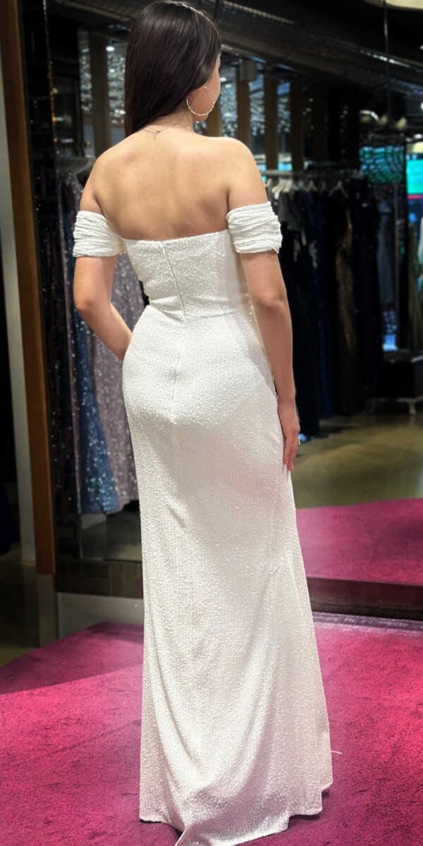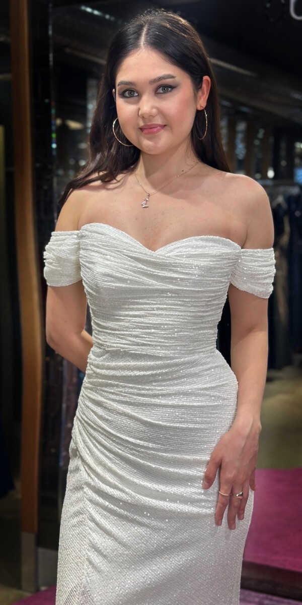 Beyaz Renk Düz Kesim Uzun Abiye Elbise, Payet Kumaştan Üretilmiş Olup Pırıltısıyla Göz Kamaştıracaktır. Yırtmaç Detayı Cesur ve Çarpıcı Bir Stil Sunacaktır.