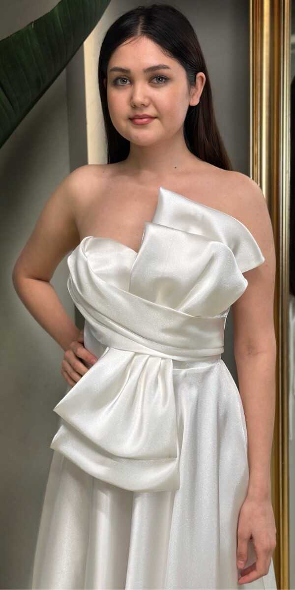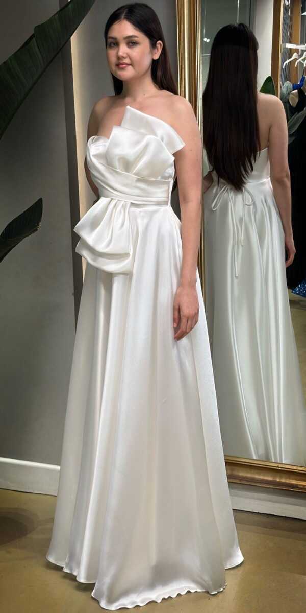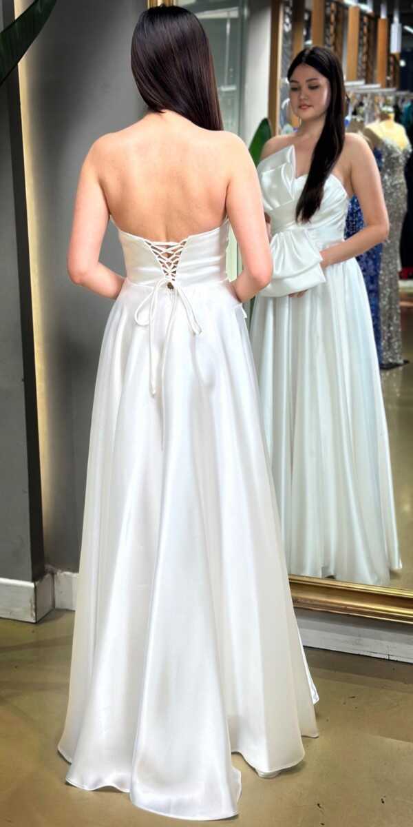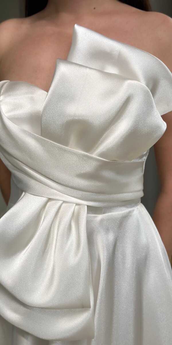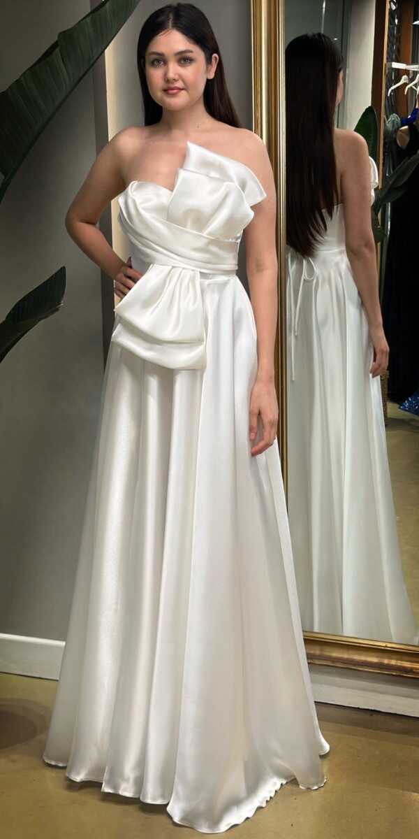 Beyaz Renk Kloş Etekli Uzun Abiye Elbise, Organze Kumaşın Vermiş Olduğu Parlaklık Ve Işıltı İle Görenleri Hayran Bırakacak. Yırtmaç Detayı Cesur ve Çarpıcı Bir Stil Sunacaktır.