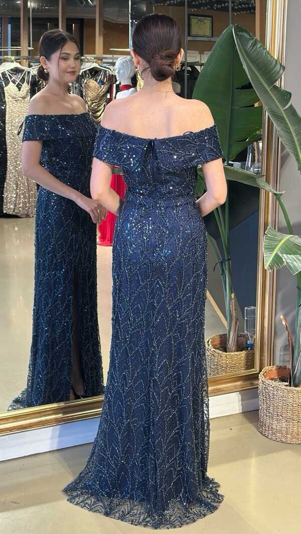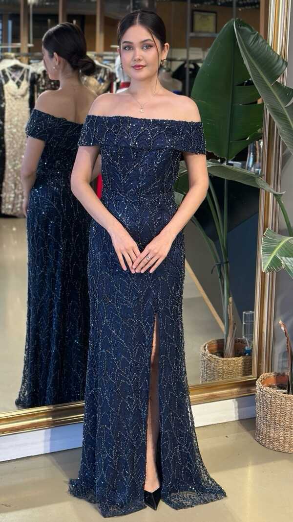 Saks Yırtmaçlı Düz Kesim Krep Uzun Abiye Elbise 7524