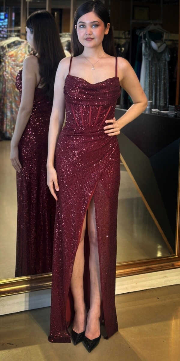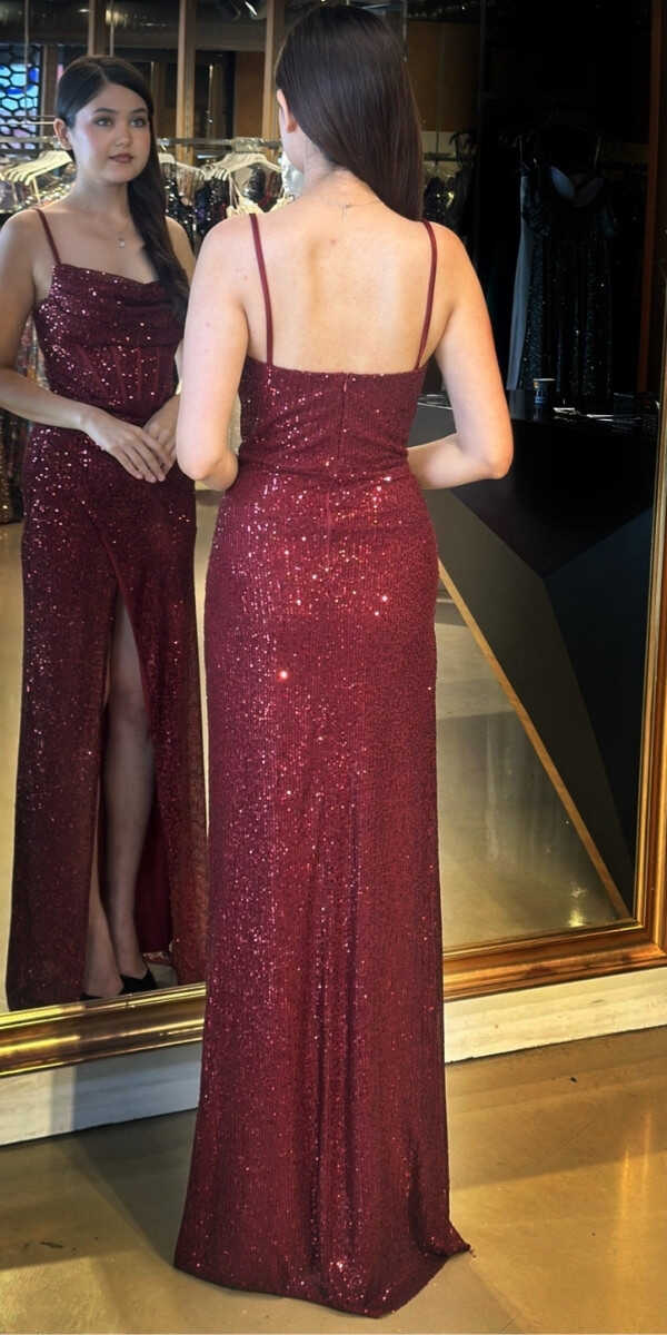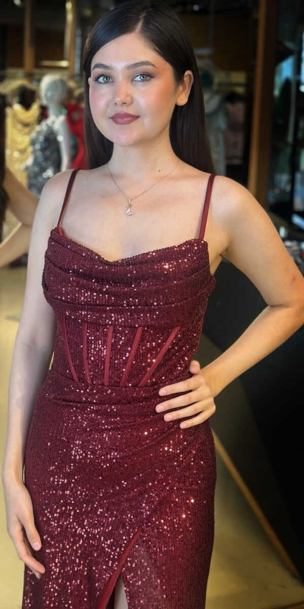 Bordo Renk Düz Kesim Uzun Abiye Elbise, Payet Kumaştan Üretilmiş olup Pırıltısıyla Göz Kamaştıracaktır. Elbisedeki İp Askılar Kullanım Kolaylığı Yaratacaktır. Yırtmaç Detayı Cesur ve Çarpıcı Bir Stil Sunacaktır.