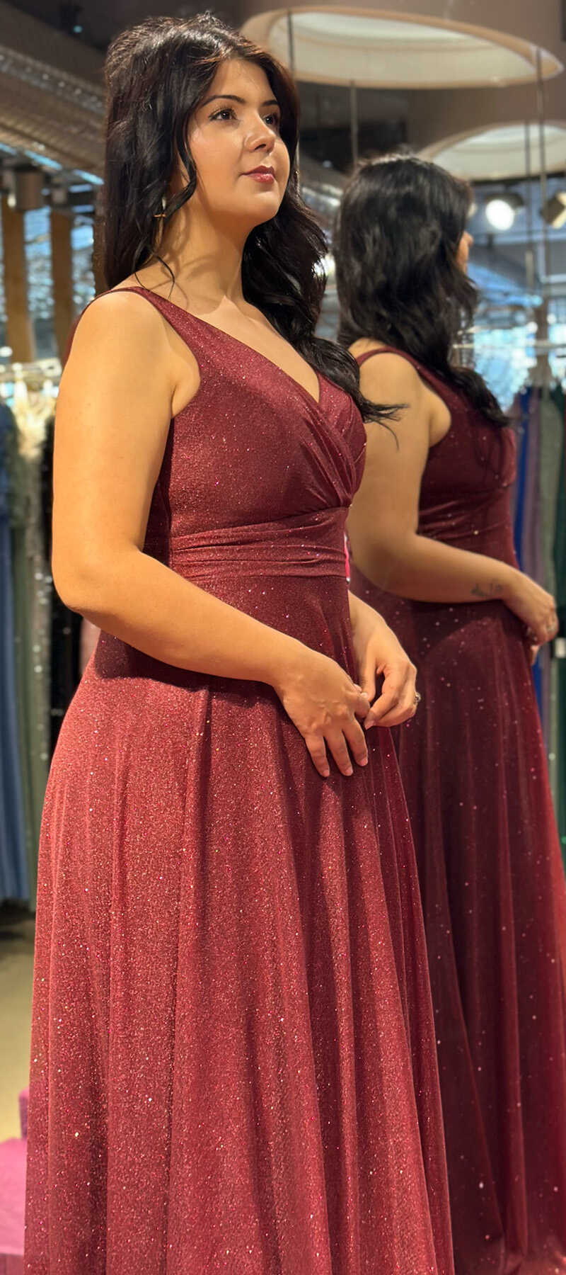Bordo Renk Kloş Etekli Uzun Abiye Elbise, Simli Kumaştan Üretilmiş Olup Işıltısıyla Göz Kamaştıracaktır.