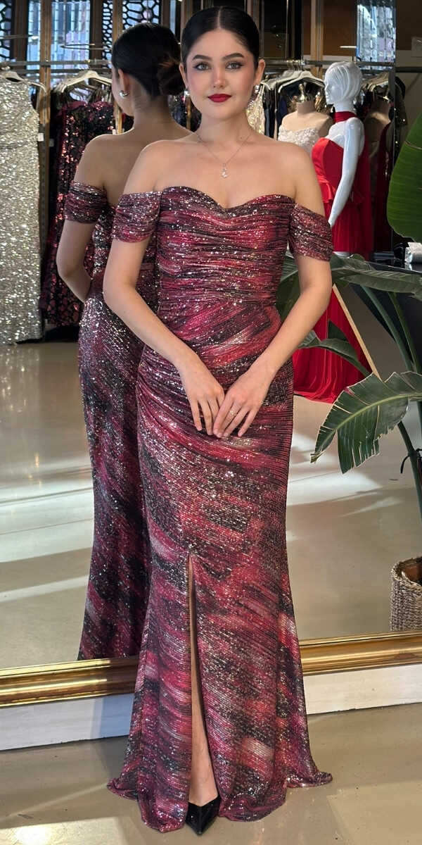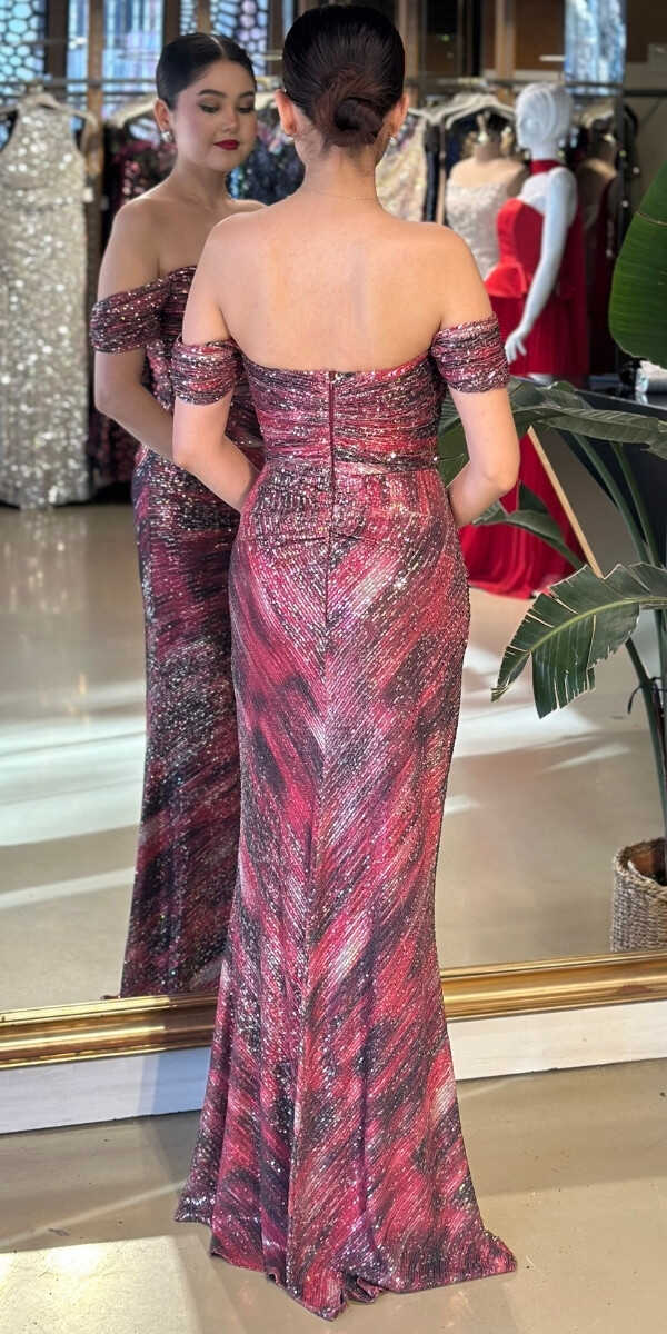 Vişne Renk Yuvarlak Yaka Uzun Kollu Tuy Detaylı Balık Etekli Pul Payet Uzun Abiye Elbise 11133-01