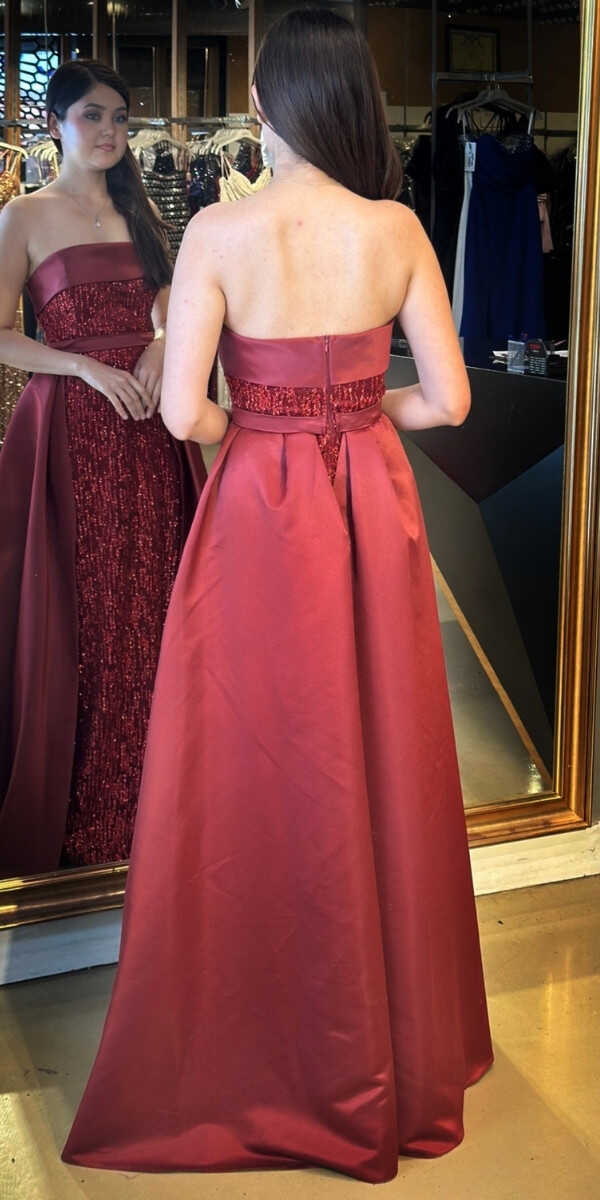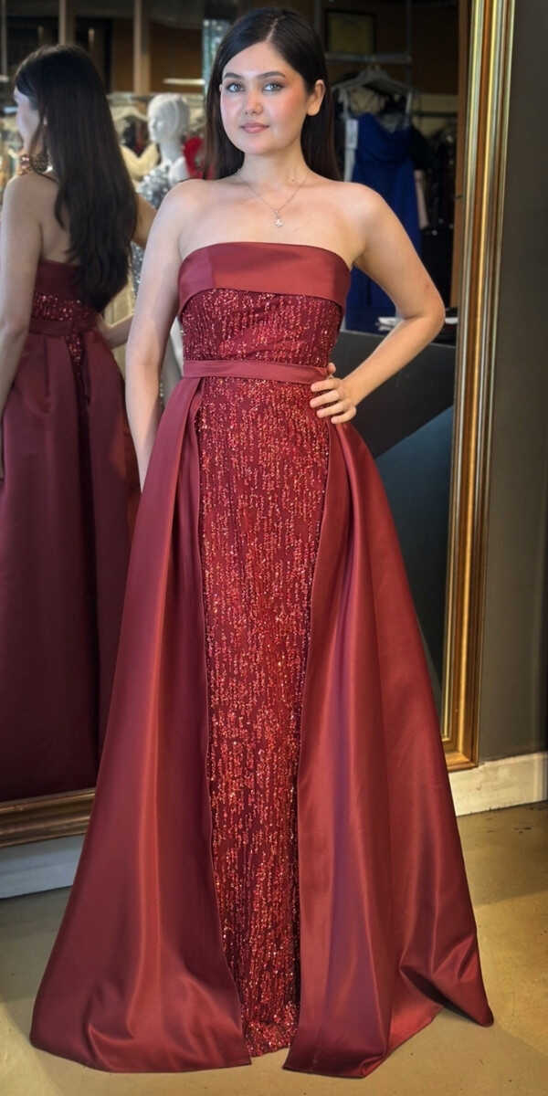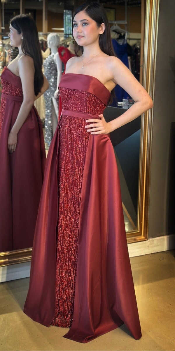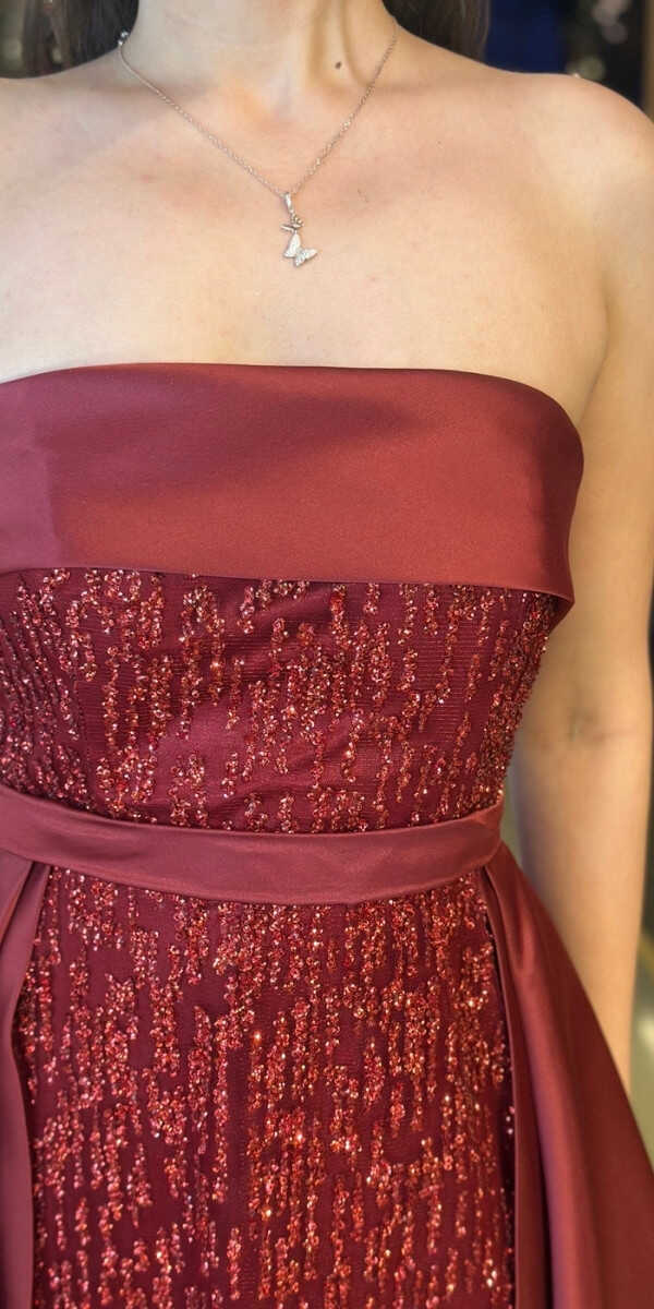 Bordo Renk Çıkarılabilir Kuyruk Uzun Abiye Elbise, Simli Kumaştan Üretilmiş olup Simlerin Işıltısıyla Çok Hoş Gözükeceksiniz
